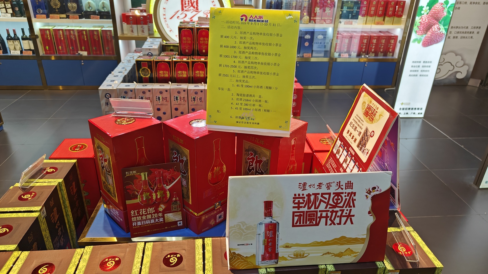 记者在成都大悦城人人乐超市内注意到,“中秋贺礼 味浓情更浓”大型促销活动正在上演,多款酒水产品参与其中。