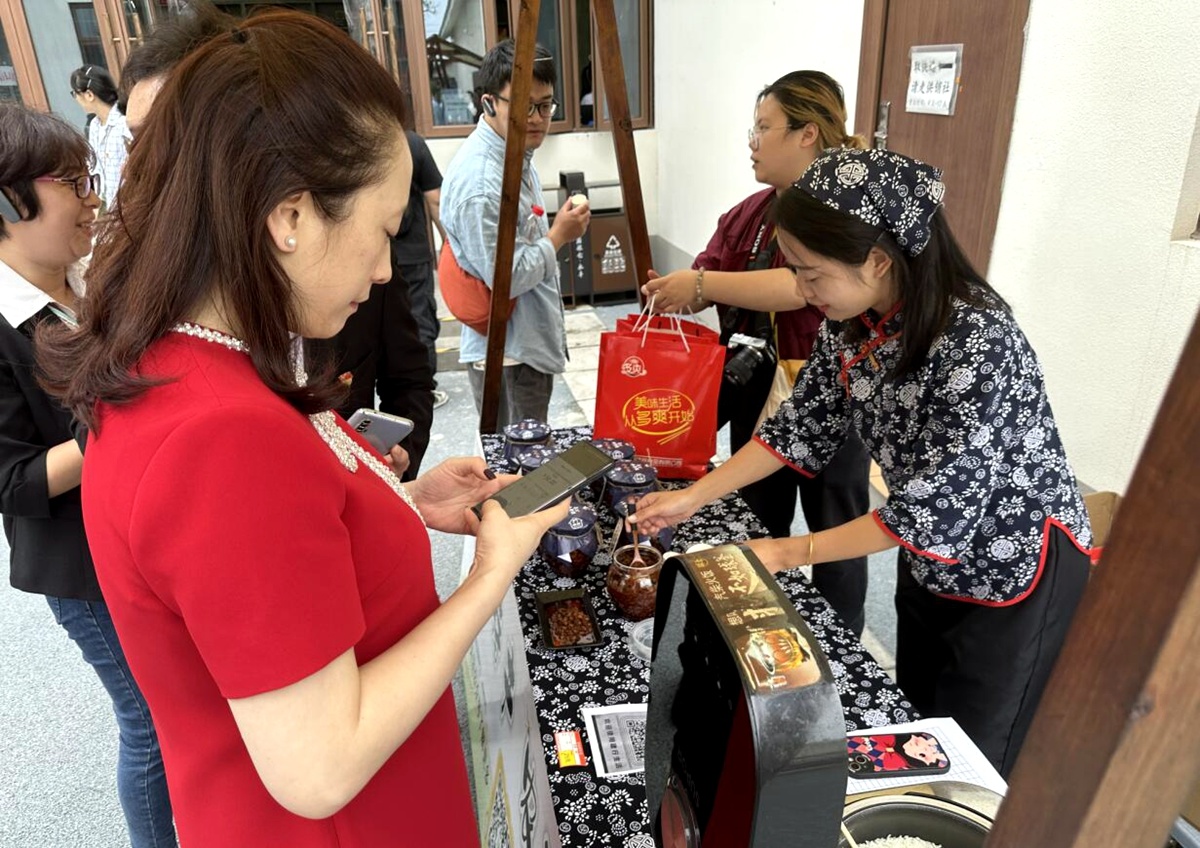 走进“丰收里”,“永丰醴”米露、米花糖、手工水豆豉……展位前人头攒动,围满了试吃、体验新产品的群众,人群中一位身穿白衬衫的工作人员正在卖力地介绍产品情况,他正是永丰村职业经理人邓凯。