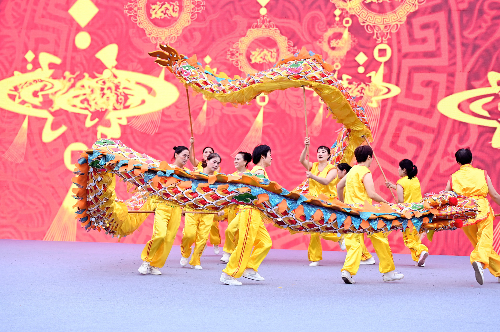 9月27日,自贡市荣县双石镇蔡家堰村,“大地欢歌”2023年全国“秋季村晚”荣县示范展示活动现场,表演者身着黄衣,举着五彩斑斓的龙,以流畅的舞龙技术让龙在空中舞动,台下观众纷纷鼓掌。