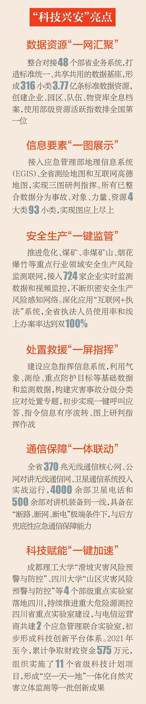 这样的高效率,得益于“科技兴安”建设的普及。近年来,四川加快应急管理安全生产科技支撑体系建设,推动科技创新与安全生产并驾齐驱、深度融合,让安全生产插上科技的“翅膀”。