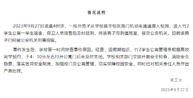 27日晚,中国政法大学保卫处发文称,当日凌晨4时许,一校外男子从学校昌平校区南门机动车通道潜入校园,进入竹2学生公寓一学生宿舍,保卫人员接警后及时赶到,将该男子带到值班室,移交公安机关。目前该男子已经被公安机关刑事拘留。