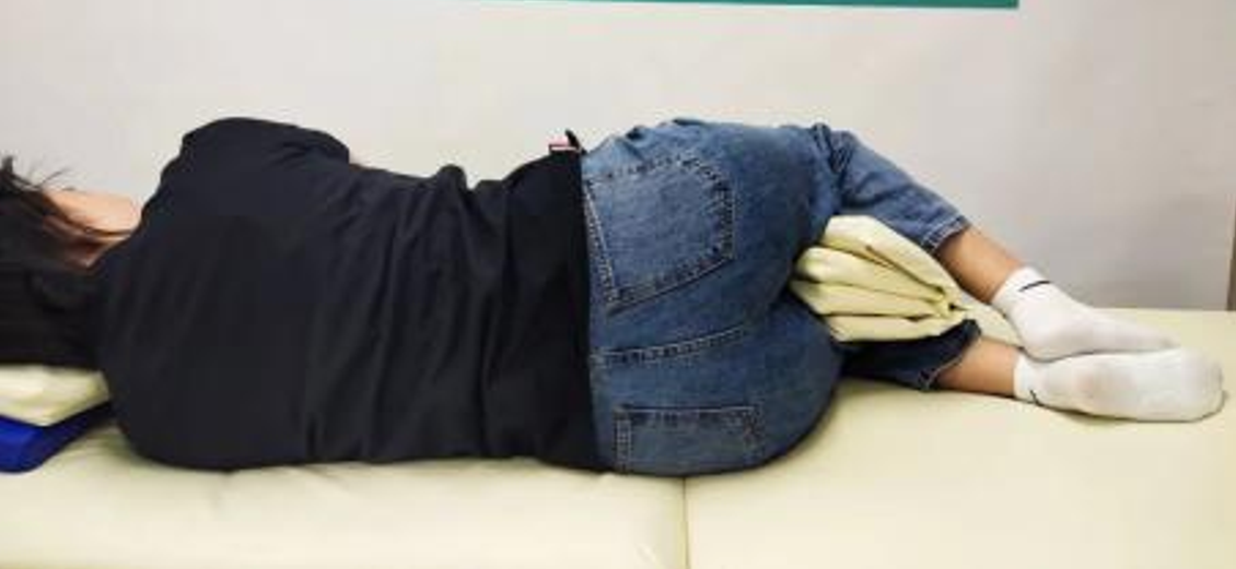 如果你习惯了两条腿前后放的侧卧方式,也可以适当只垫高上面的腿。
