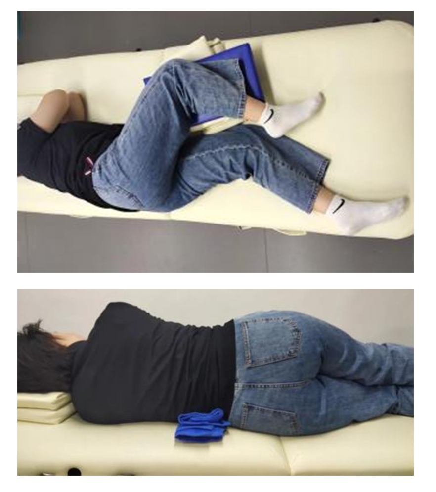 仰卧的时候,我们可以在腿弯处垫一个或者两个枕头,这样可以让股骨(大腿骨)的髂腰肌的长度缩短释放它的张力,另外也可以让我们的腰部更贴合床面,得到更有效的支撑。