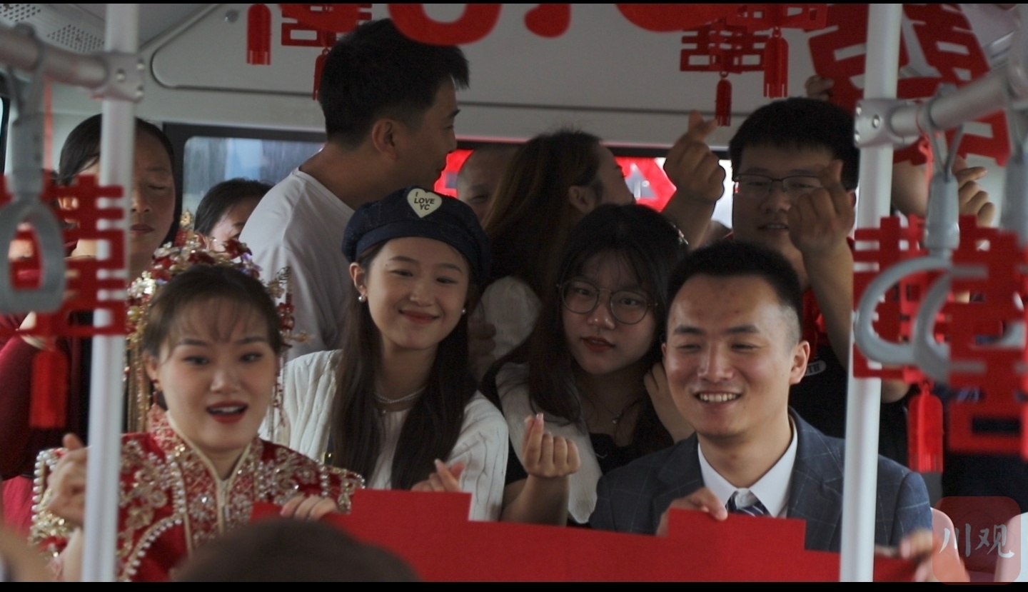 身着中式礼服的新娘挽着西装革履的新郎,在众多亲朋好友的陪伴下,一起登上这辆“幸福专车”。一路上,亲朋好友齐聚一车,说笑聊天、唱歌欢乐。沿途市民纷纷挥手招呼、录视频拍照,见证这“低碳”新时尚的接亲方式。