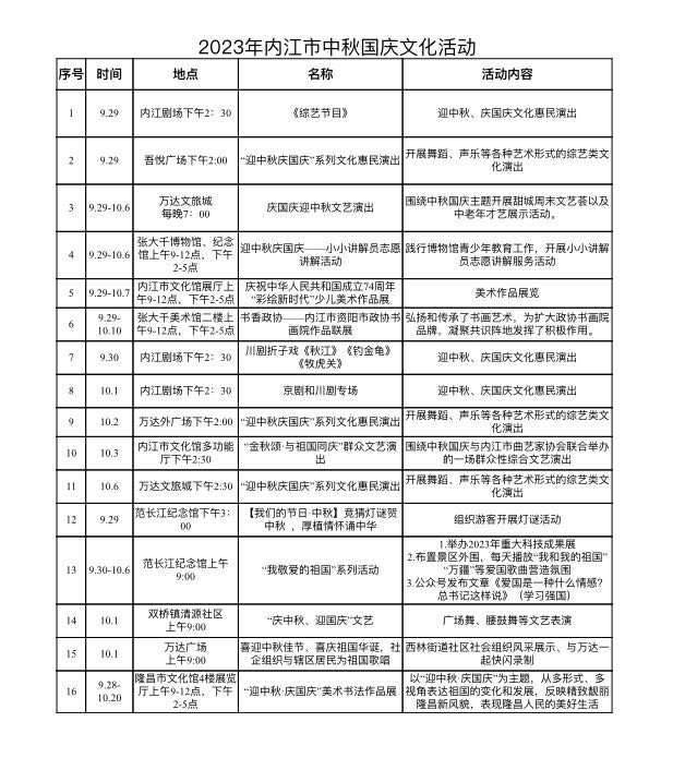 其中,包括隆昌市2023年“万人赏月诵中秋”活动、市中区黄鹤湖旅游区农耕文化草雕艺术节、资中县2023年国学文化旅游活动周等。