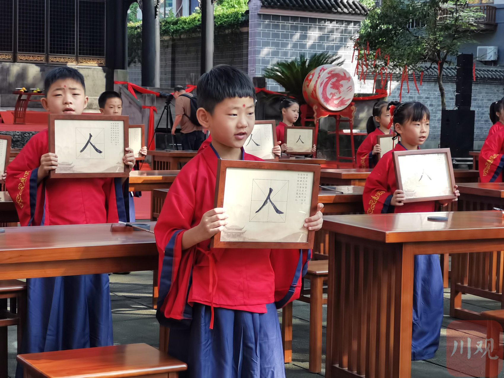 祭孔大典结束后,夫子入场,数位小学生在文庙举行开笔礼。大家在夫子的引导下相继完成了正衣冠、行拜师礼、朱砂启智、写字装裱等仪式,老师用毛笔在小学生眉心轻点朱砂,小学生们互相整理衣冠后向夫子作揖行礼。