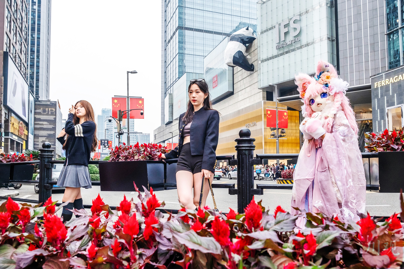 春熙路商圈街道两侧悬挂着鲜艳的五星红旗,游客纷纷拍照打卡。