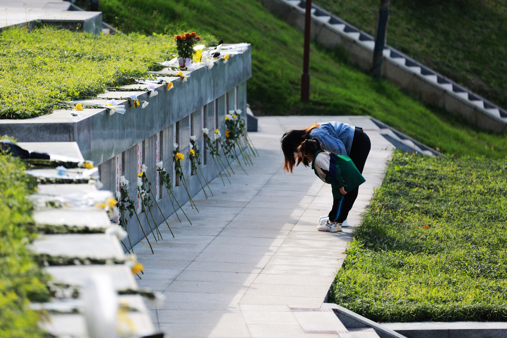 一位母亲带着女儿来到宜宾市烈士陵园向烈士们行鞠躬礼。