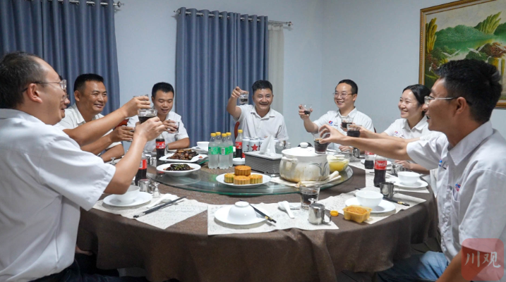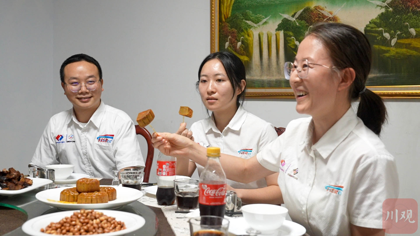 下午18时许,天渐渐擦黑,月饼、水煮肉片、甜皮鸭、豆花……丰盛的菜肴陆续摆盘,大家陆续落座,两名担任翻译的印尼员工也被邀请上桌。从工地上赶回的张果,率先叉了一块月饼:“好吃!”这段时间,他忙着和印尼方合建公司处理排水沟的施工,每天看着高铁上动车疾驰却没时间去坐,今天终于确定了施工图,“预计一周左右能做完。”