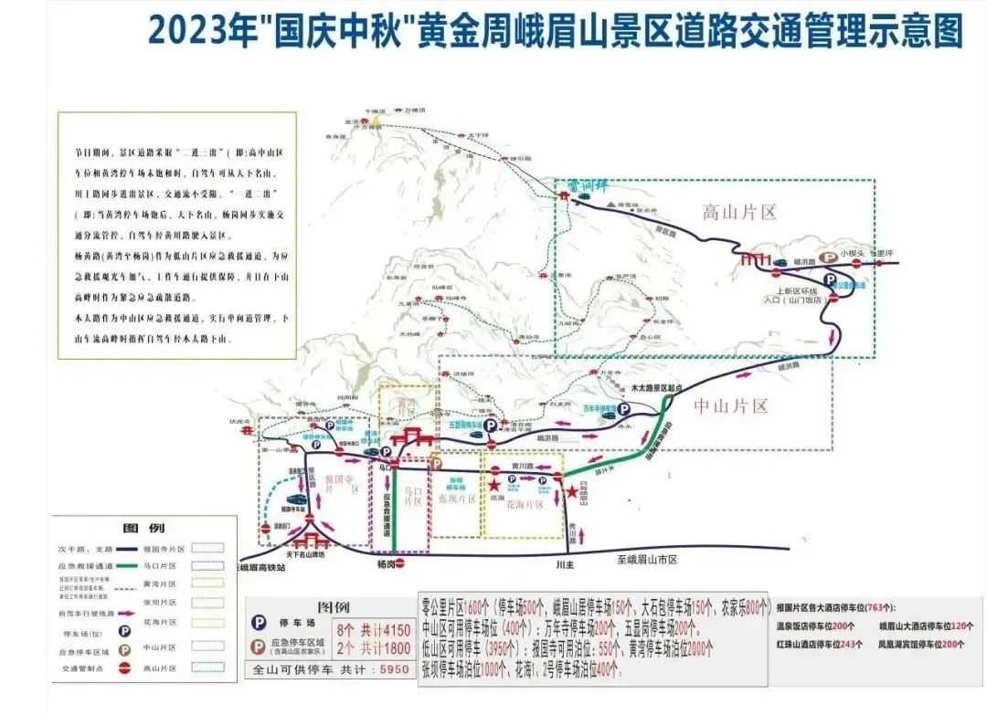 双节期间,峨眉山景区道路将采取“二进三出”方式管理。即:高中山区车位和黄湾停车场未饱和时,自驾车可从天下名山、川主路同步进出景区,交通流不受限。“一进二出”,当黄湾停车场饱和后,天下名山、杨岗同步实施交通分流管控,自驾车经黄川路驶入景区。黄湾至杨岗作为低山片区应急救援通道,为应急救援观光车加气、工作车通行提供保障,并且在下山高峰时作为紧急应急疏散道路。木太路作为中山区应急救援通道,实行单向道管理,下山车流高峰时指挥自驾车经木太路下山。