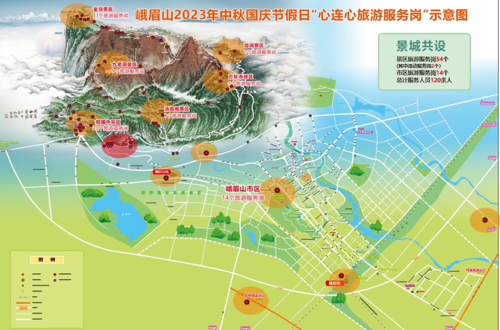 中秋、国庆期间峨眉山景城设有“心连心旅游服务岗”,景区旅游服务岗54个、市区旅游服务岗14个,总计服务人员120余人,全力保障游客吃、住、行、游、购、娱。