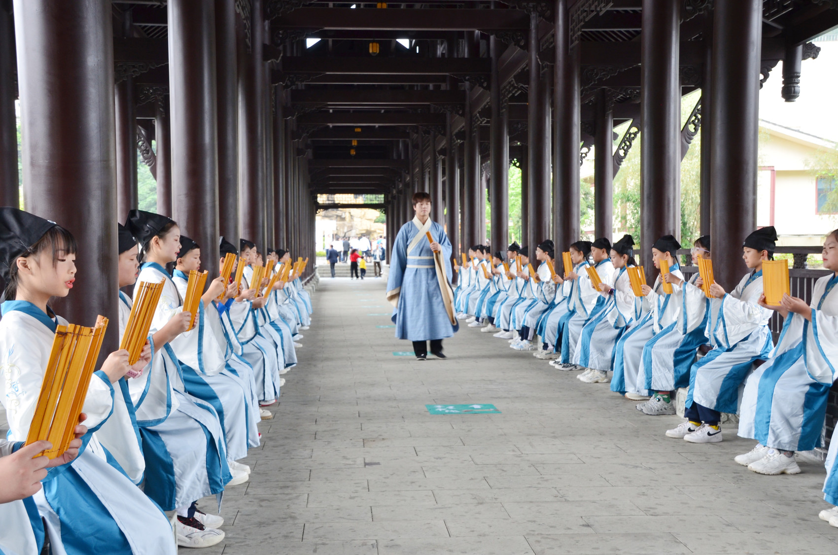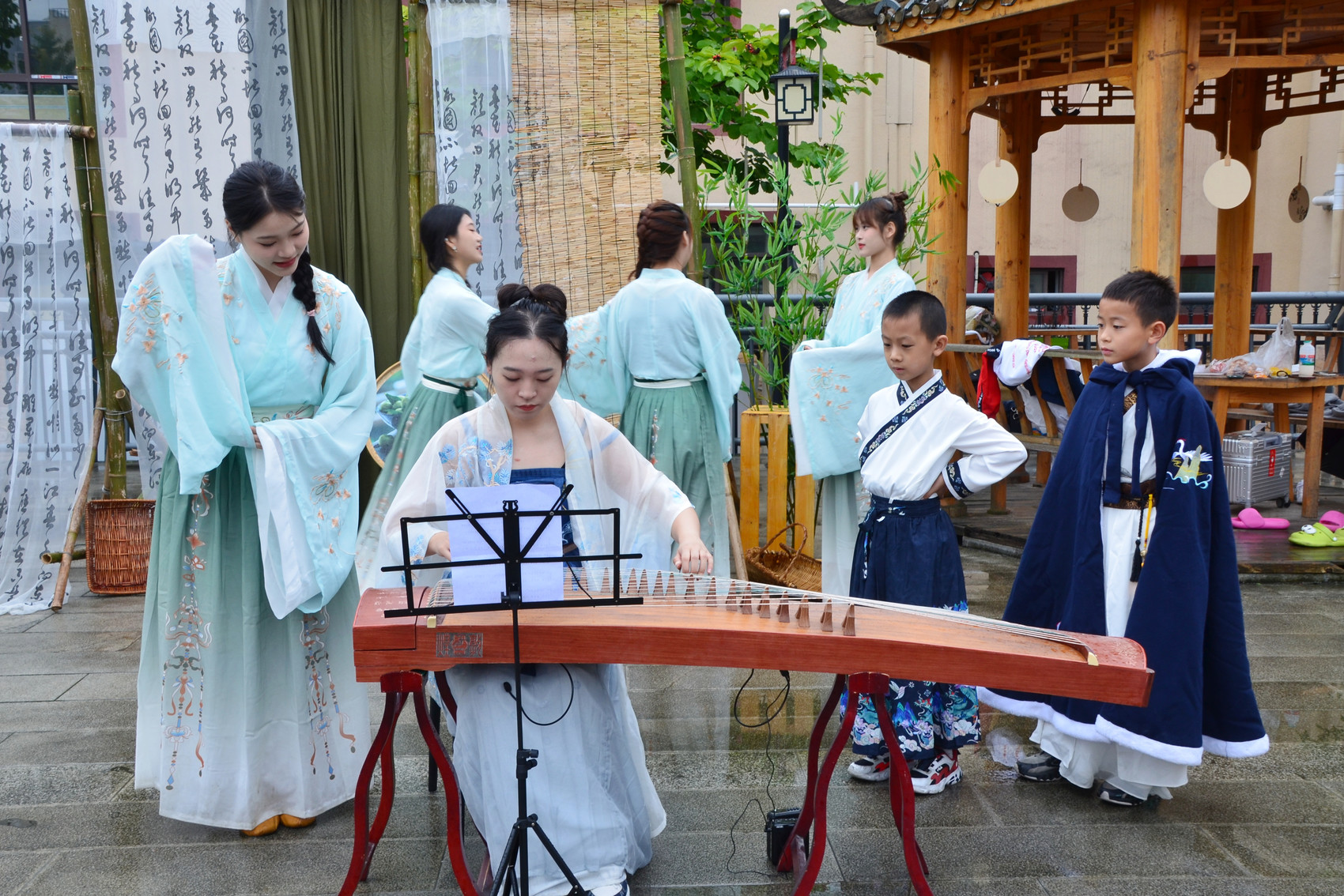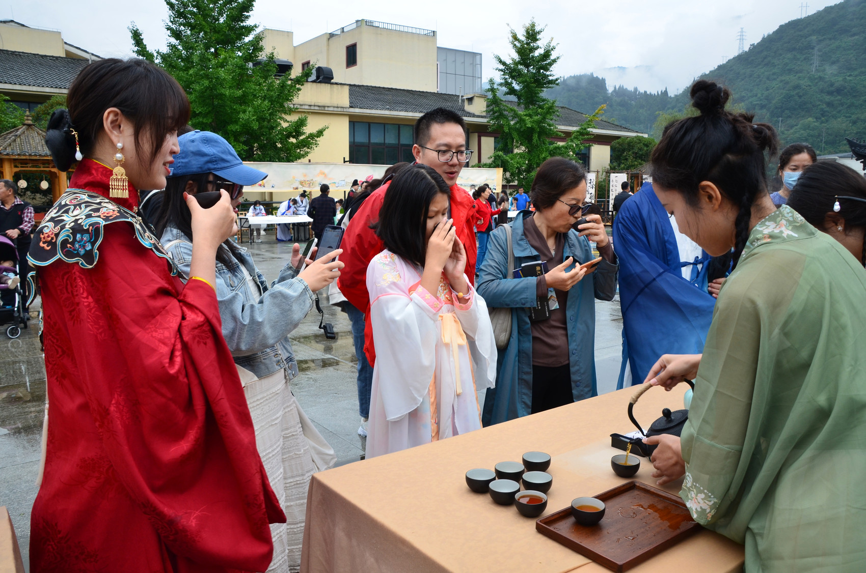 上午,在水磨古镇禅城桥头山居桃源乡入口处,长寿老人吟颂着:“梨园歌舞会场开,时式新妆逐日来。”在活动主场山居桃源乡,设置了穿越时空的钟鼓、茅屋书院—寿溪湖畔的吟唱、诗画有云舍、长寿饮、水磨坊、多巴胺集市、桃源奇异世界、篾艺等八大沉浸式场景,游客可现场参与八大场景的沉浸式互动活动。