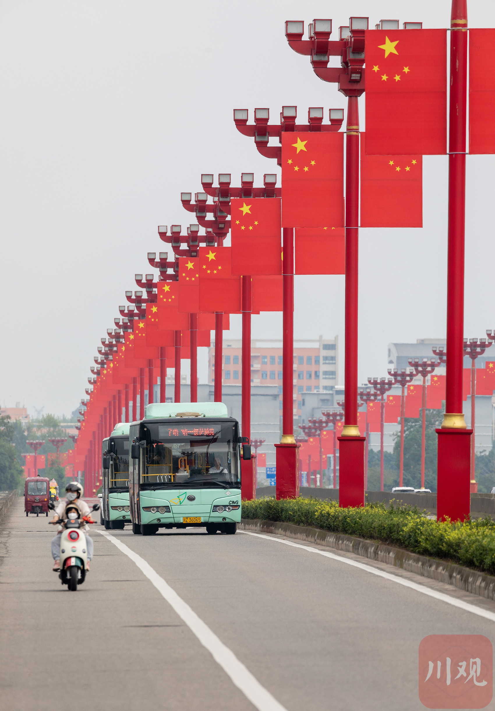 9月29日,眉山市城区岷江二桥,每一根灯柱上都悬挂了鲜艳的五星红旗,与红色的灯柱一起,构成了最美“中国红”。