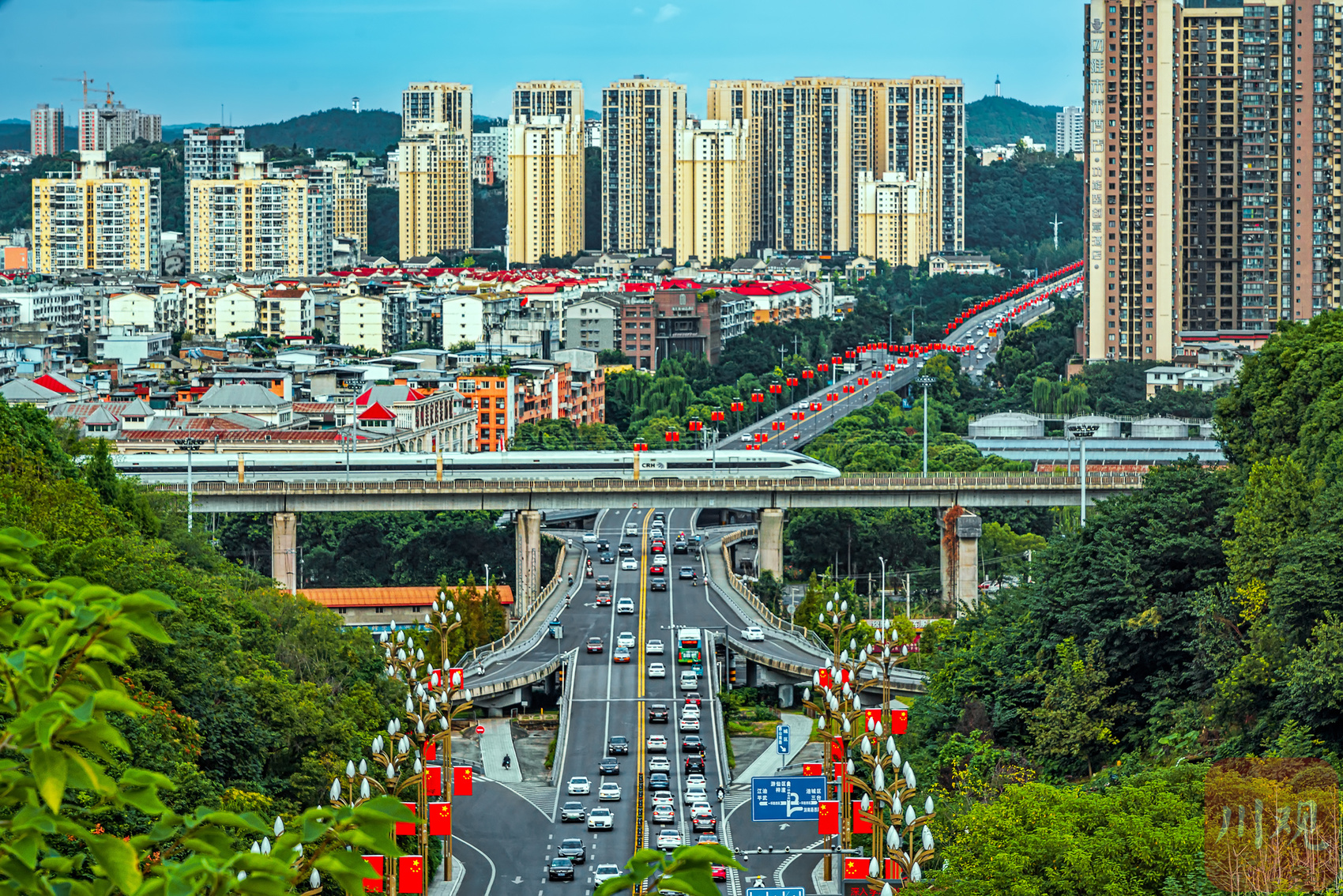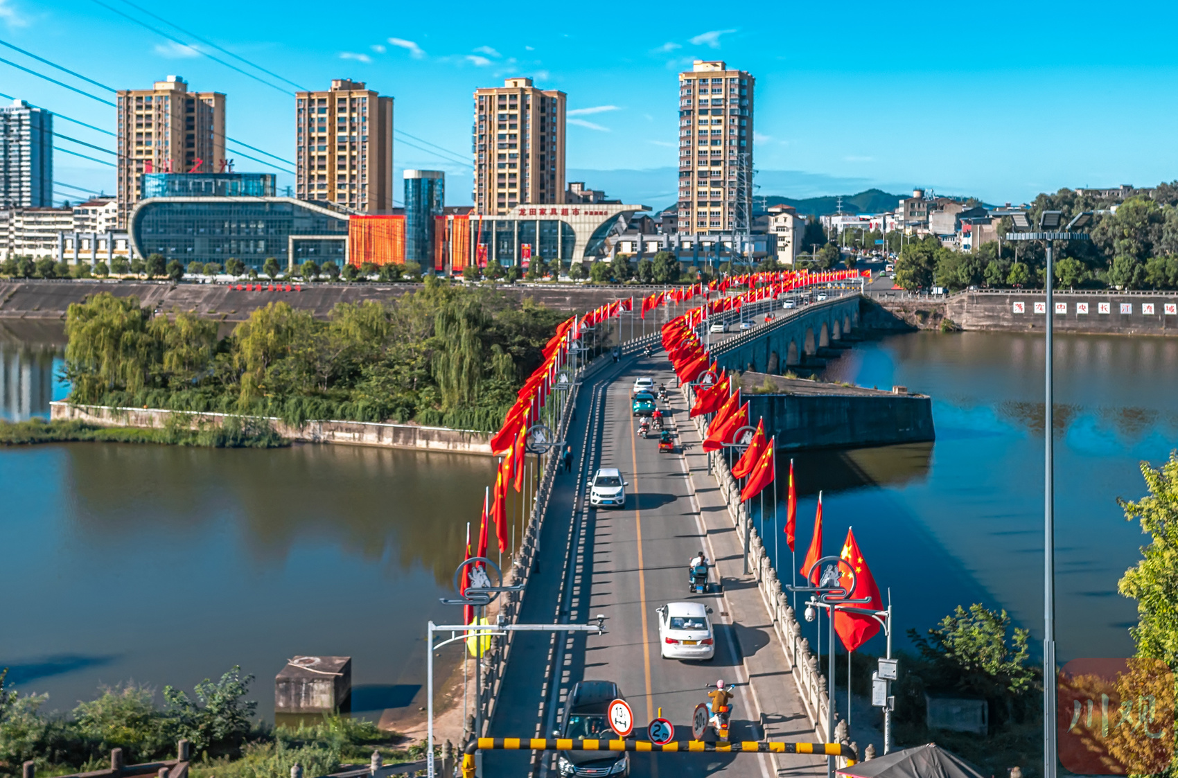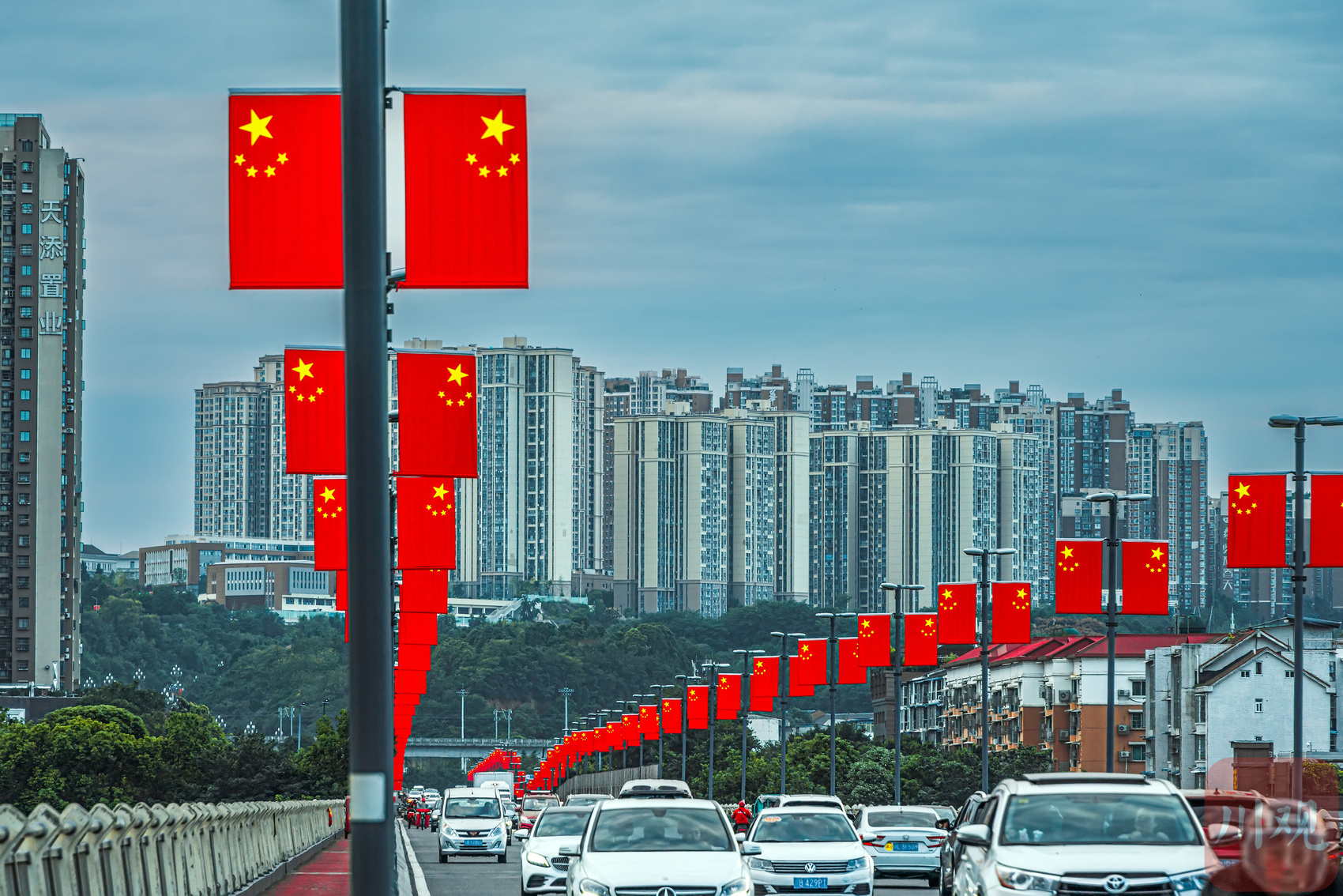 9月28日,绵阳市涪江二桥道路两旁挂满了国旗,满城洋溢“中国红”。