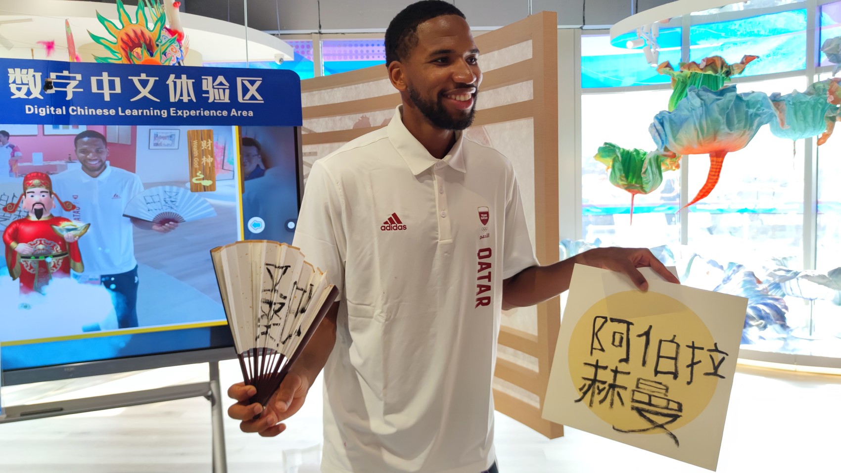 卡塔尔运动员阿伯拉赫曼展示自己的书法作品。郑志浩 摄