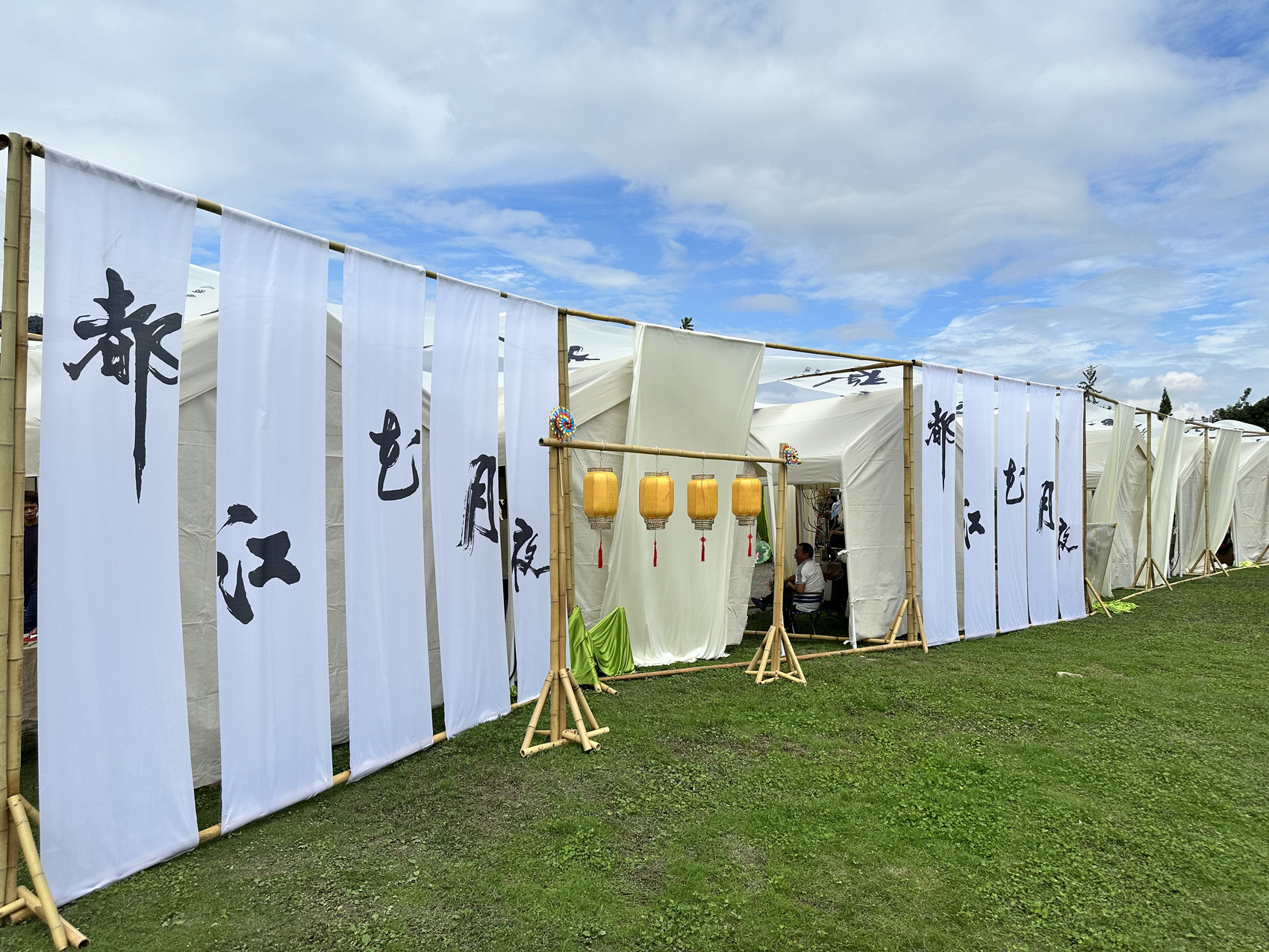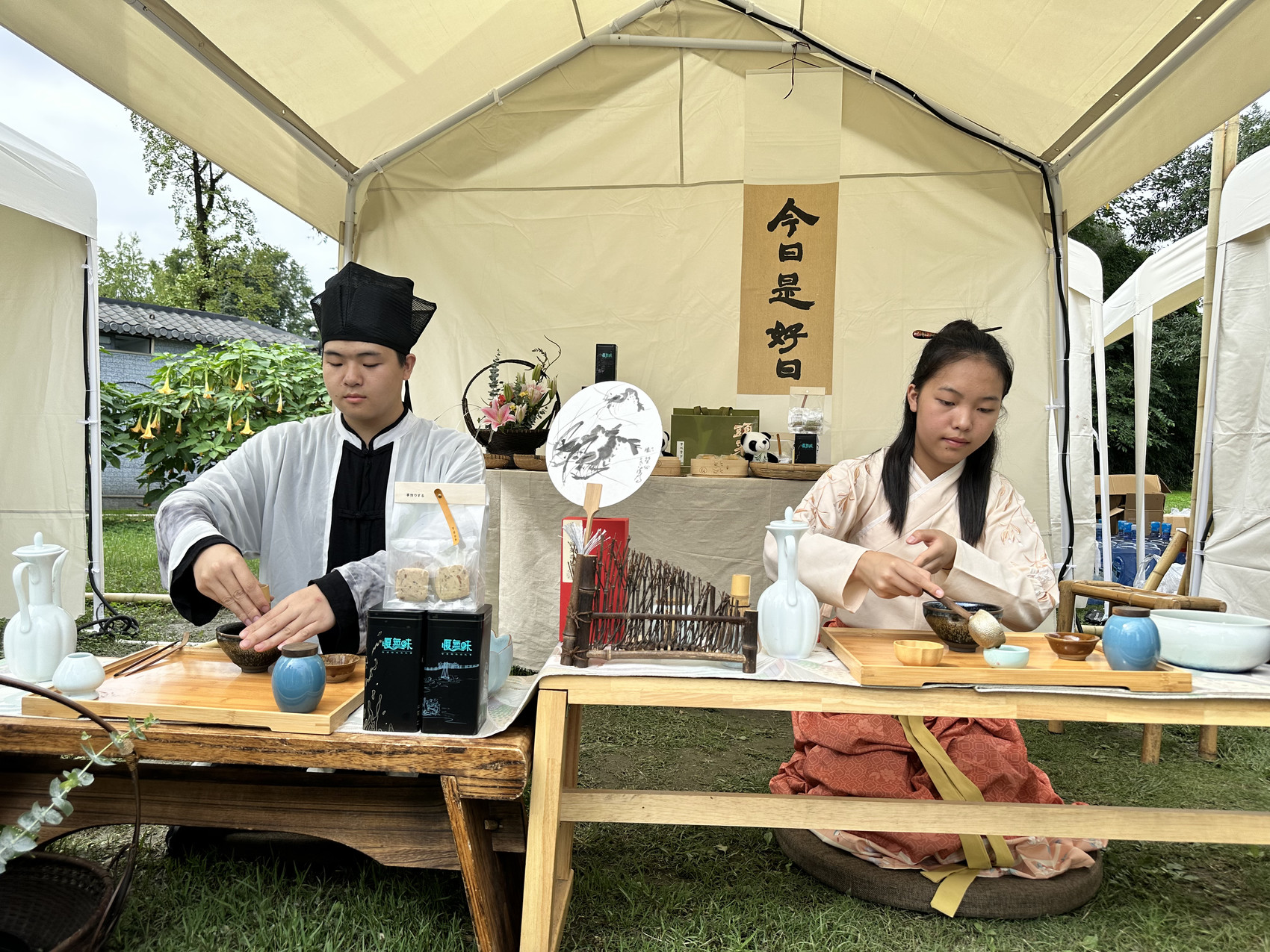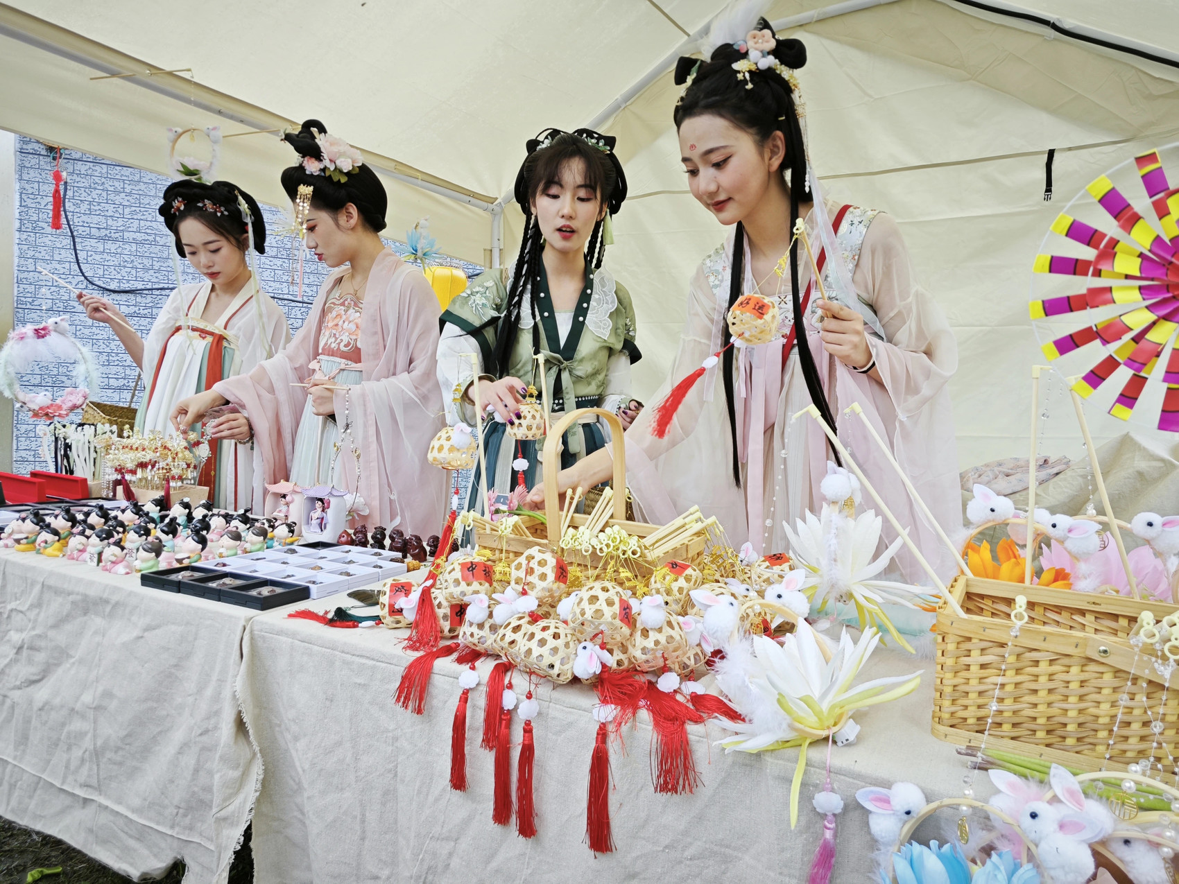 集市挂满了长长的冰绸,川观新闻记者穿梭其中,文创手作、服饰配饰、国风潮品、糕点小食……数十个摊位吸引着八方来客。都江堰市爱茶小时空有限公司工作人员赵宇航身着汉服,为游客演示茶艺;一旁的摊位,“天府好水”产品——来自本地的啤酒和汽水颇受游客欢迎。武汉游客李文婷也换装汉服:“这个古风市集的氛围感太好了,大概古人过中秋或许就是这个场景吧,我真有“一秒穿越”的感觉。”