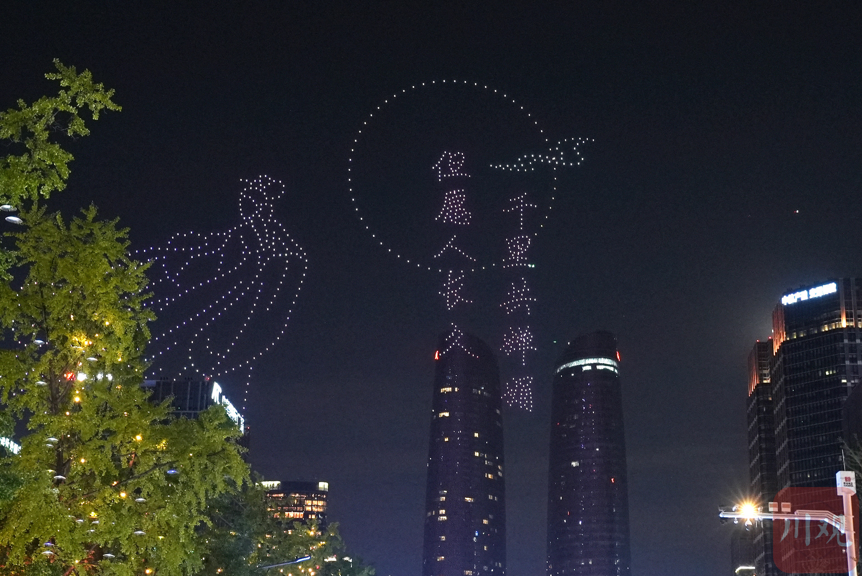 当晚,成都高新区天府双塔诗词主题光影秀光彩夺目,千余架无人机组成的方阵大秀在天空中幻化成多幅动态诗画,引起阵阵欢呼。
