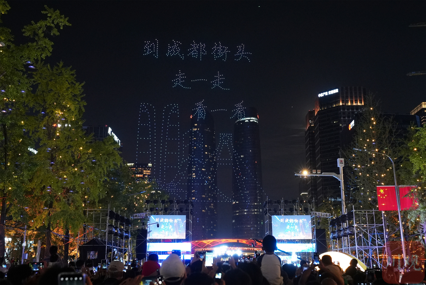 千余架无人机在空中绘成“到成都街头,走一走,看一看”字样。