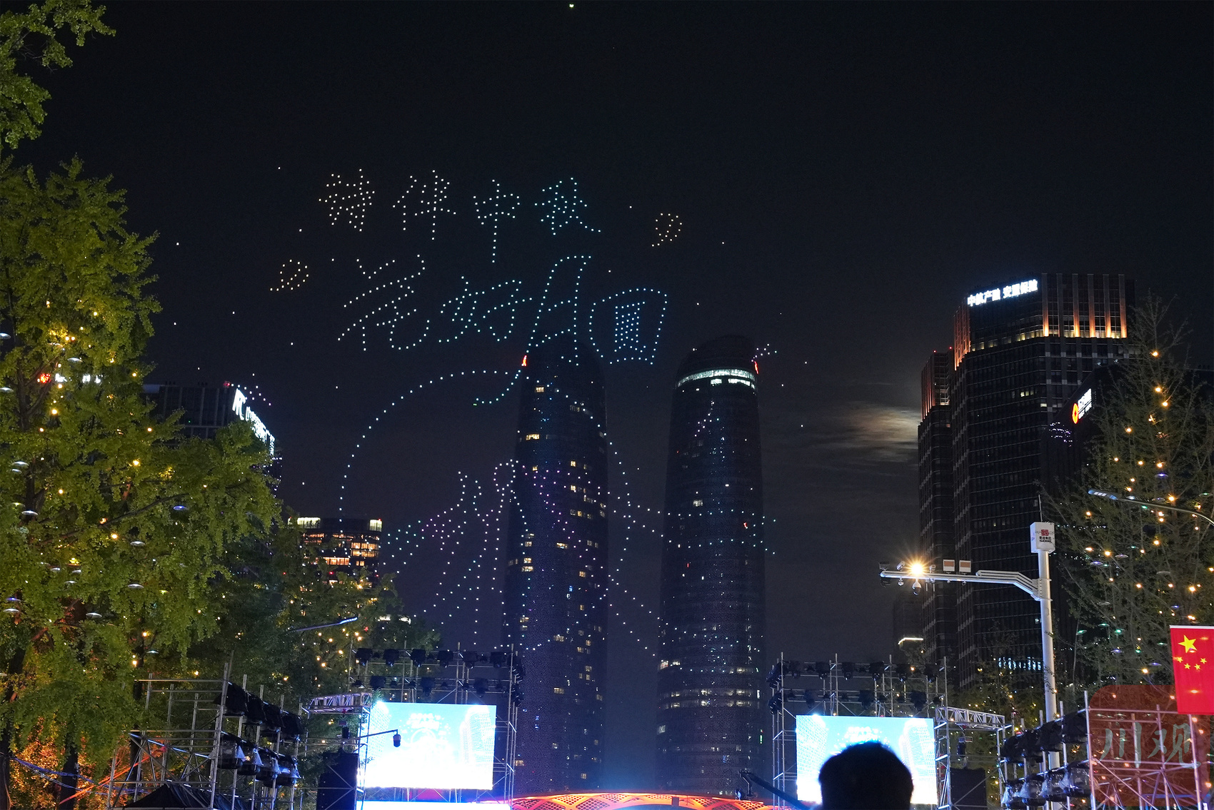 千余架无人机在空中绘成“诗伴中秋,花好月圆”字样。