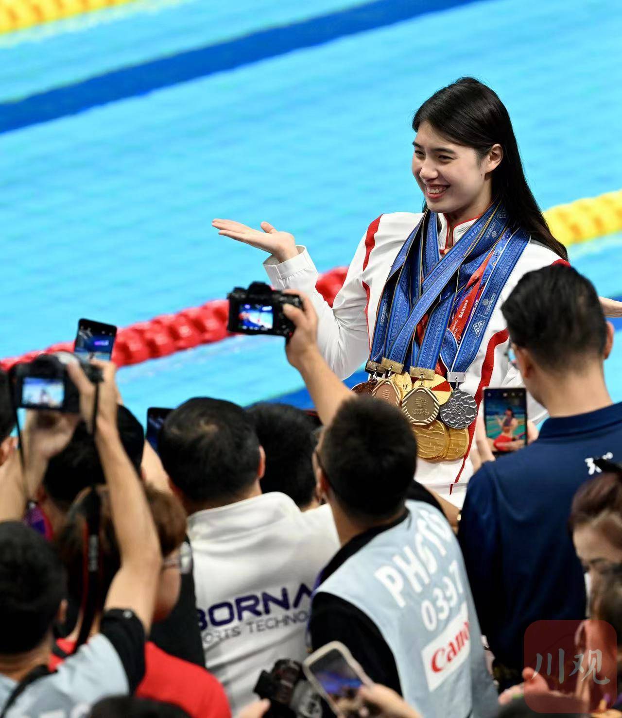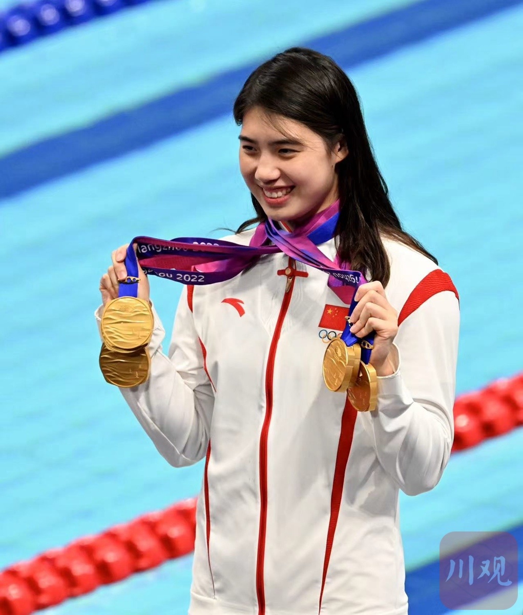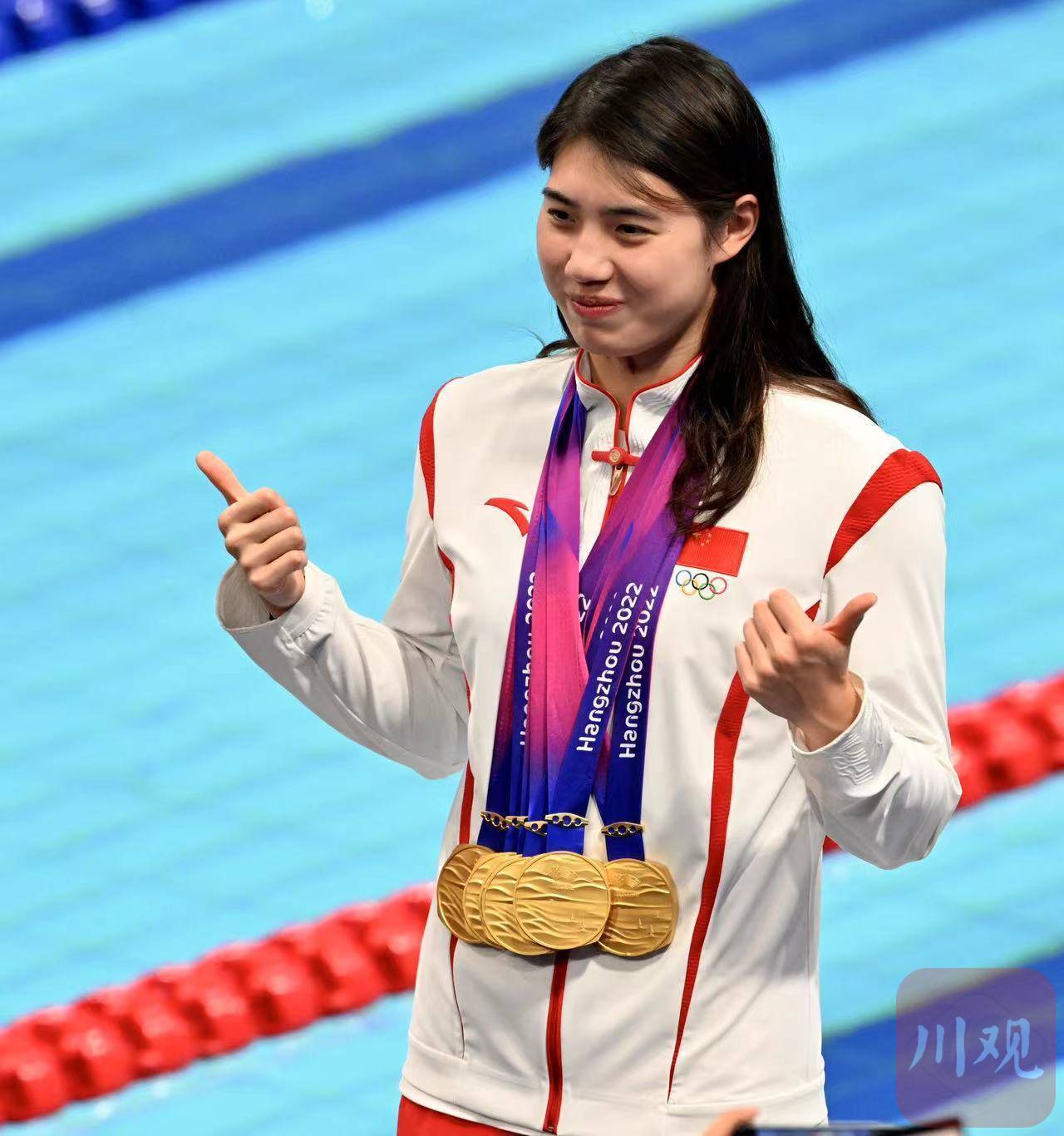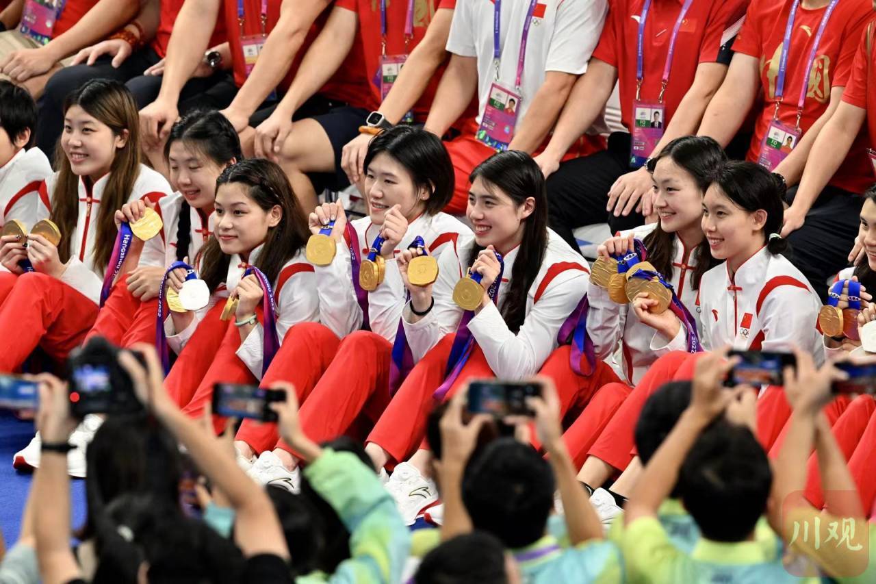 9月29日,杭州亚运会游泳比赛在杭州奥体中心游泳馆迎来收官日。赛后,拿到个人第六金中国游泳队张雨霏带领全队晒金牌。