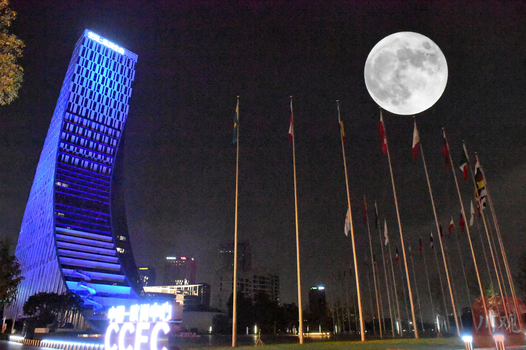 9月29日晚,十五的月亮与中国-欧洲中心。(二次曝光拍摄)