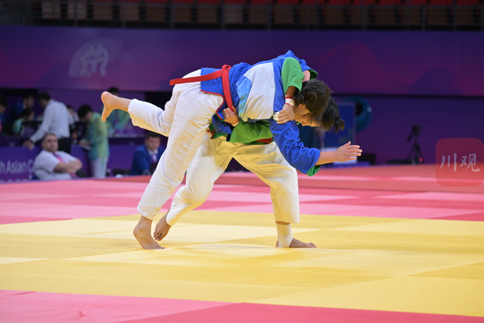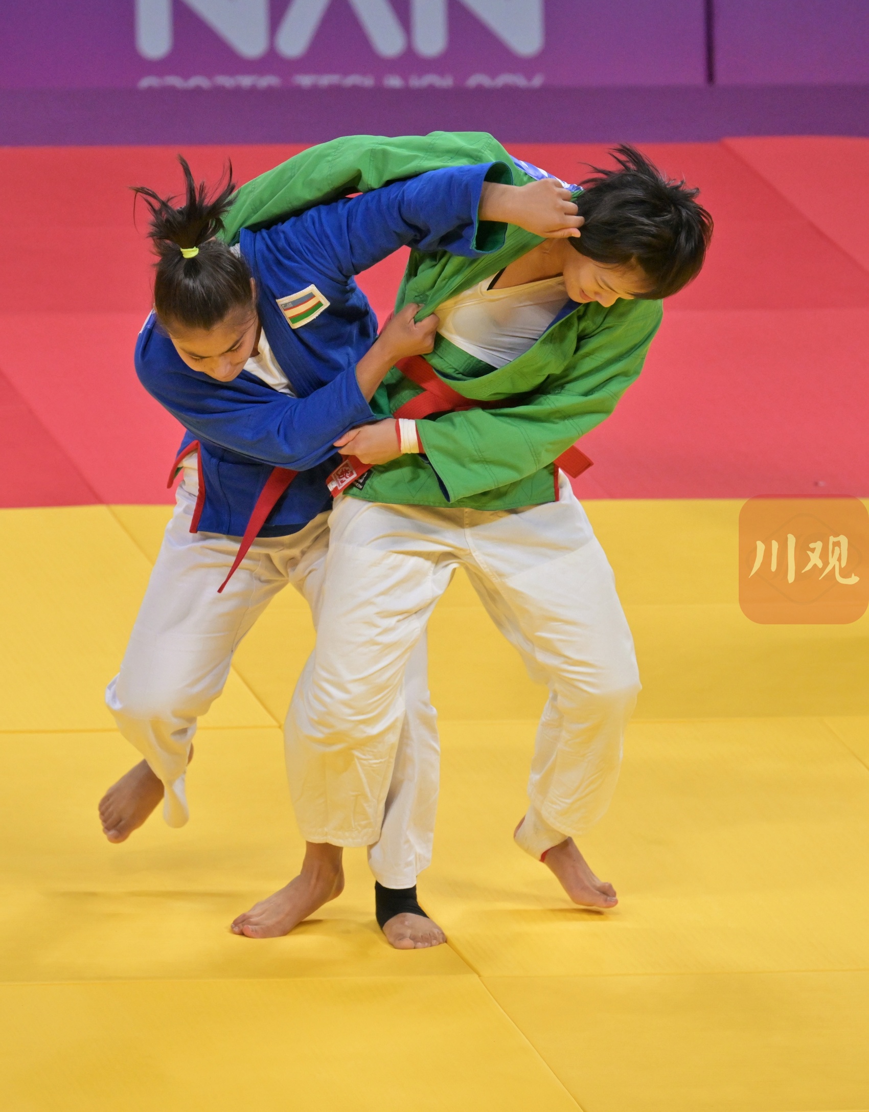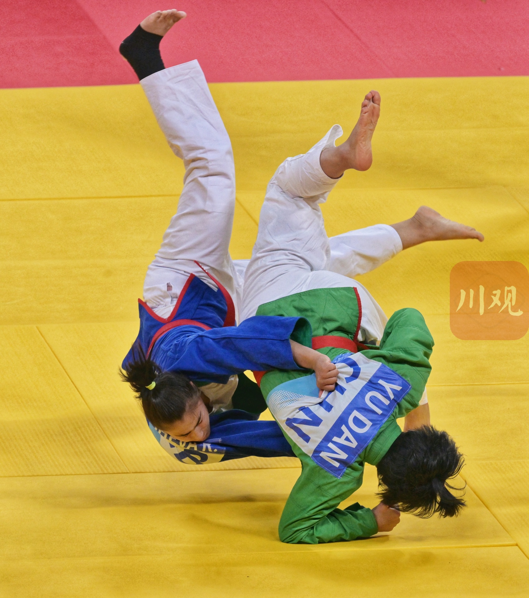 这是中国女子选手于丹(绿衣)与吉尔吉斯斯坦梅里姆 莫穆诺娃(蓝衣)在比赛中。