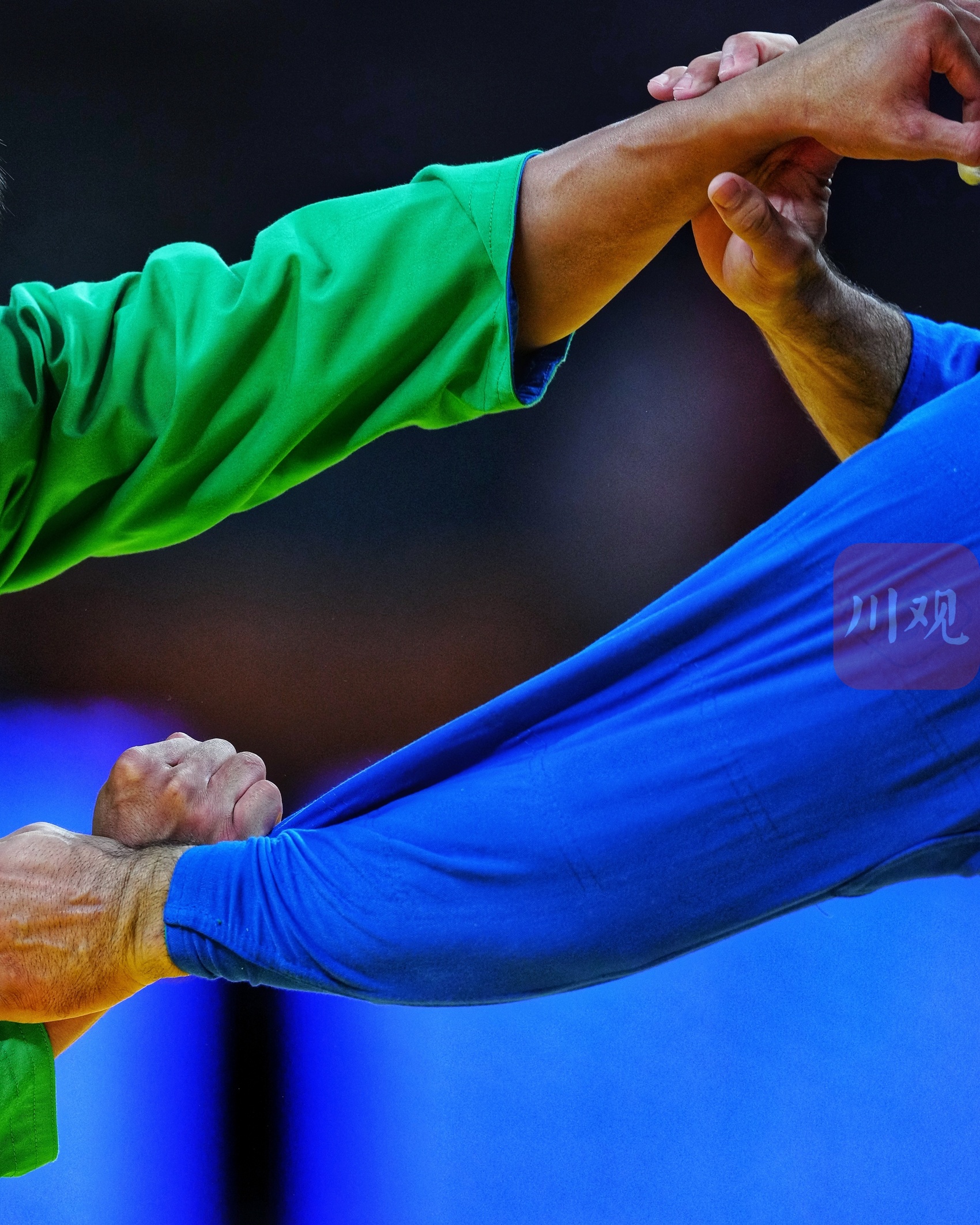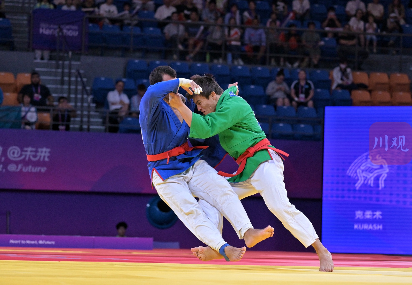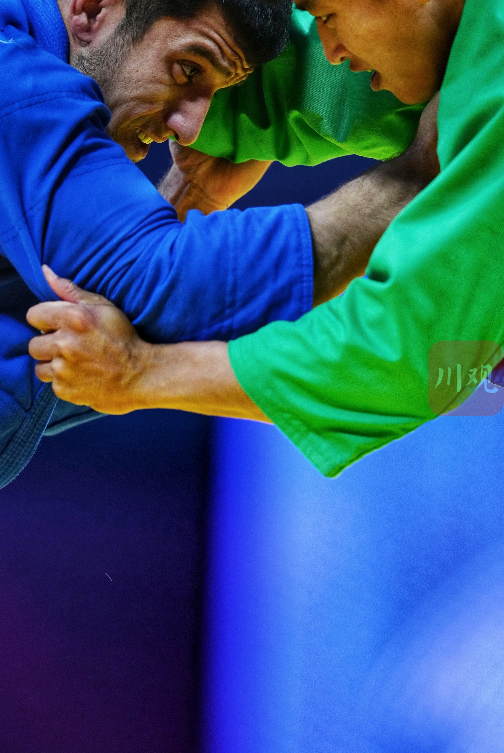 这是塔吉克斯坦选手纳夫鲁兹 卡里姆佐德(蓝衣)与哈萨克斯坦选手别卡季尔 沙伊梅尔杰诺夫(绿衣)在比赛中对决。