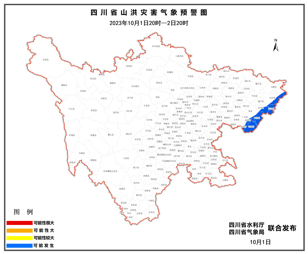 10月1日,四川省水利厅、四川省气象局联合发布山洪灾害蓝色预警。