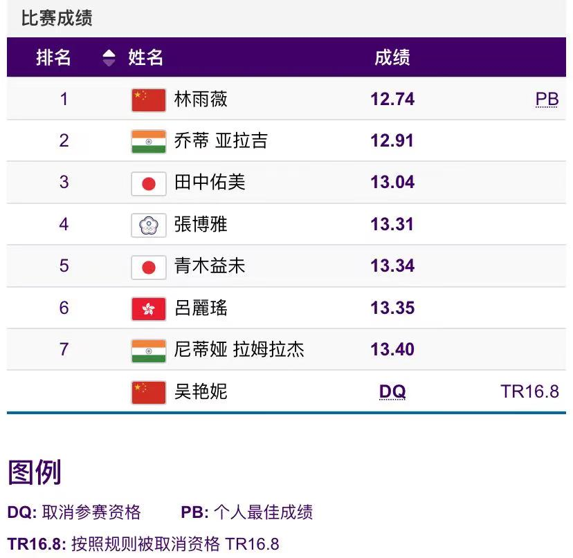 吴艳妮的成绩被取消,判罚的规则是TR16.8(即起跑犯规)——根据官方报告中的判罚结果,吴艳妮最终没有成绩的原因无疑就是第一枪的抢跑犯规。