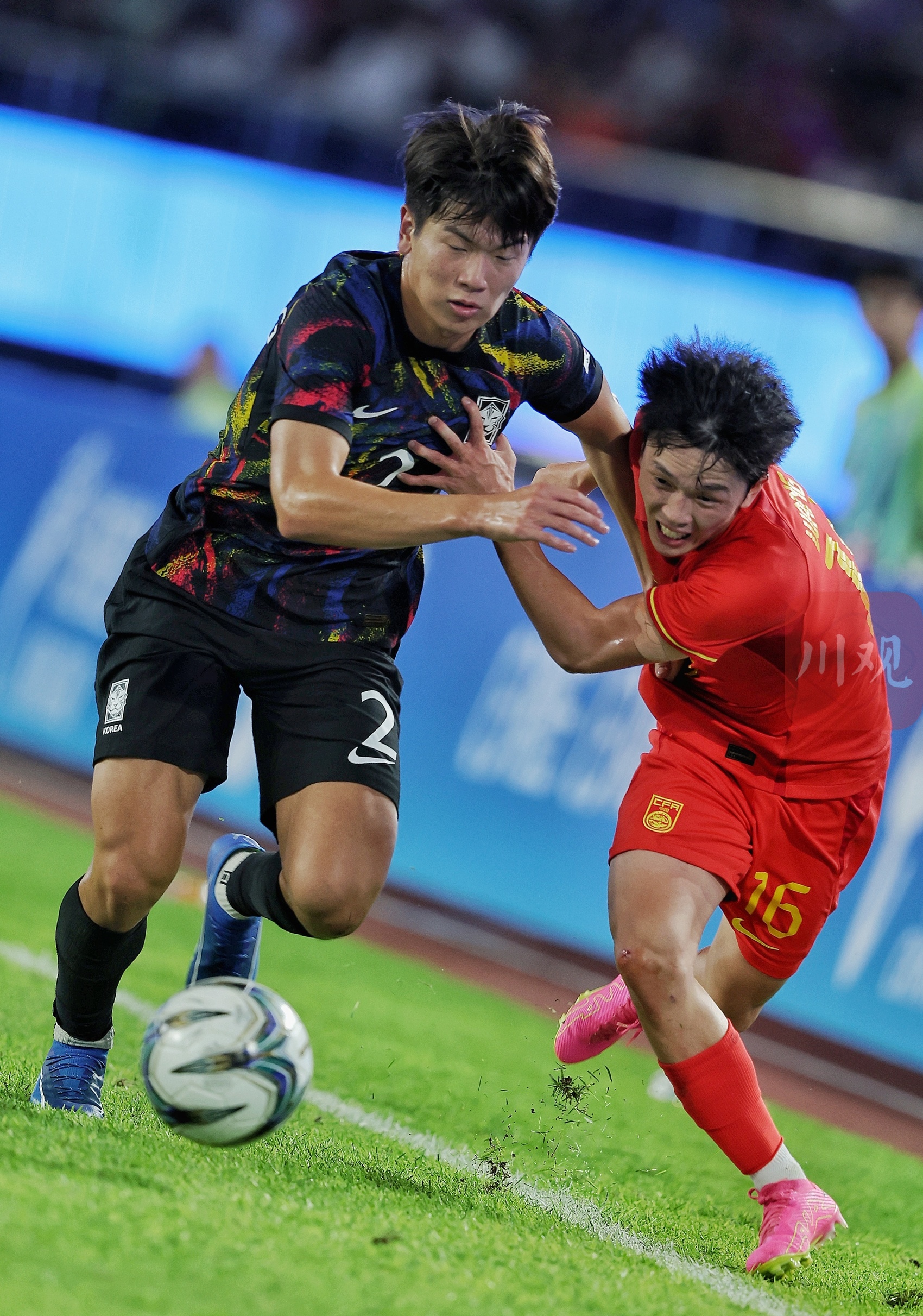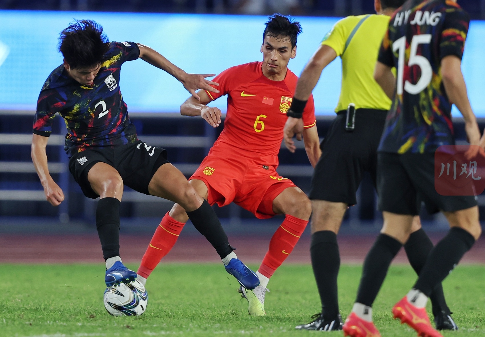 中国队(红衣)与韩国队在场上拼抢