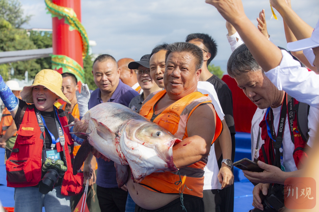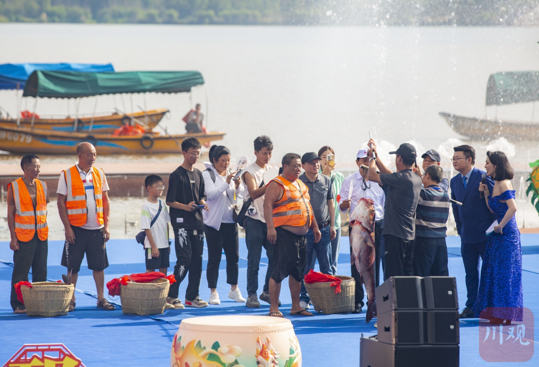 开海现场还邀请观众参与本届开海节鱼王的评选,从万斤邛海鱼中,称重比拼、选出鱼王,最终由杨国伟捕获的重达86斤的大鱼力压其他参赛“选手”,荣膺“捕鱼王”称号。