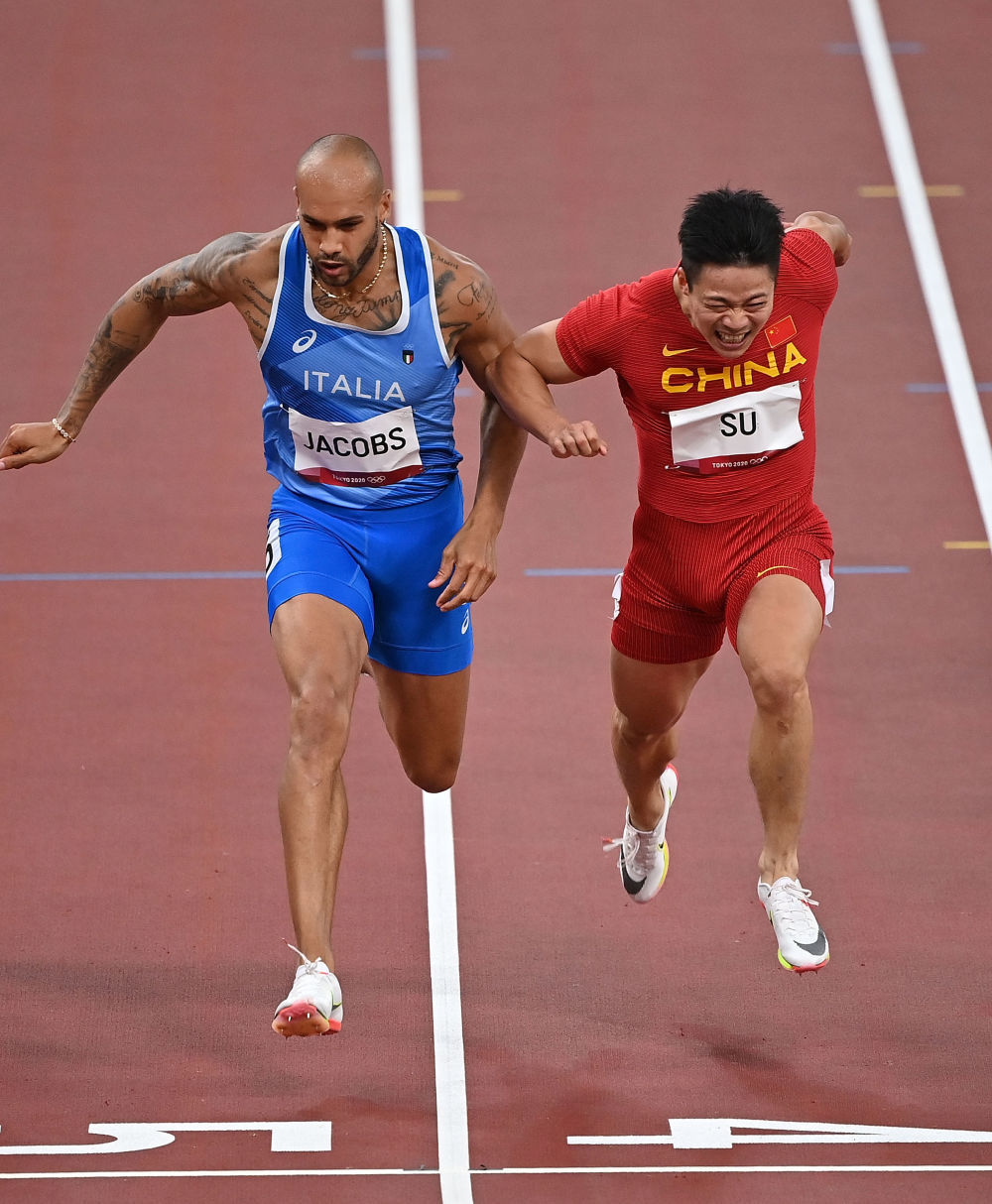 2021年8月1日,苏炳添(右)在东京奥运会田径男子100米半决赛中冲刺。新华社记者贾宇辰摄