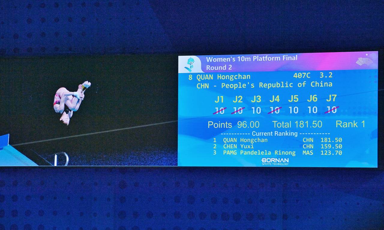 10月3日,在杭州奥体中心游泳馆,女子跳水10米台的中国姐妹花对决中,全红婵以不到3分的微弱优势夺得冠军。队友陈芋汐获得银牌。马来西亚选手潘德莱拉·里农 阿纳克·帕姆格获得铜牌。