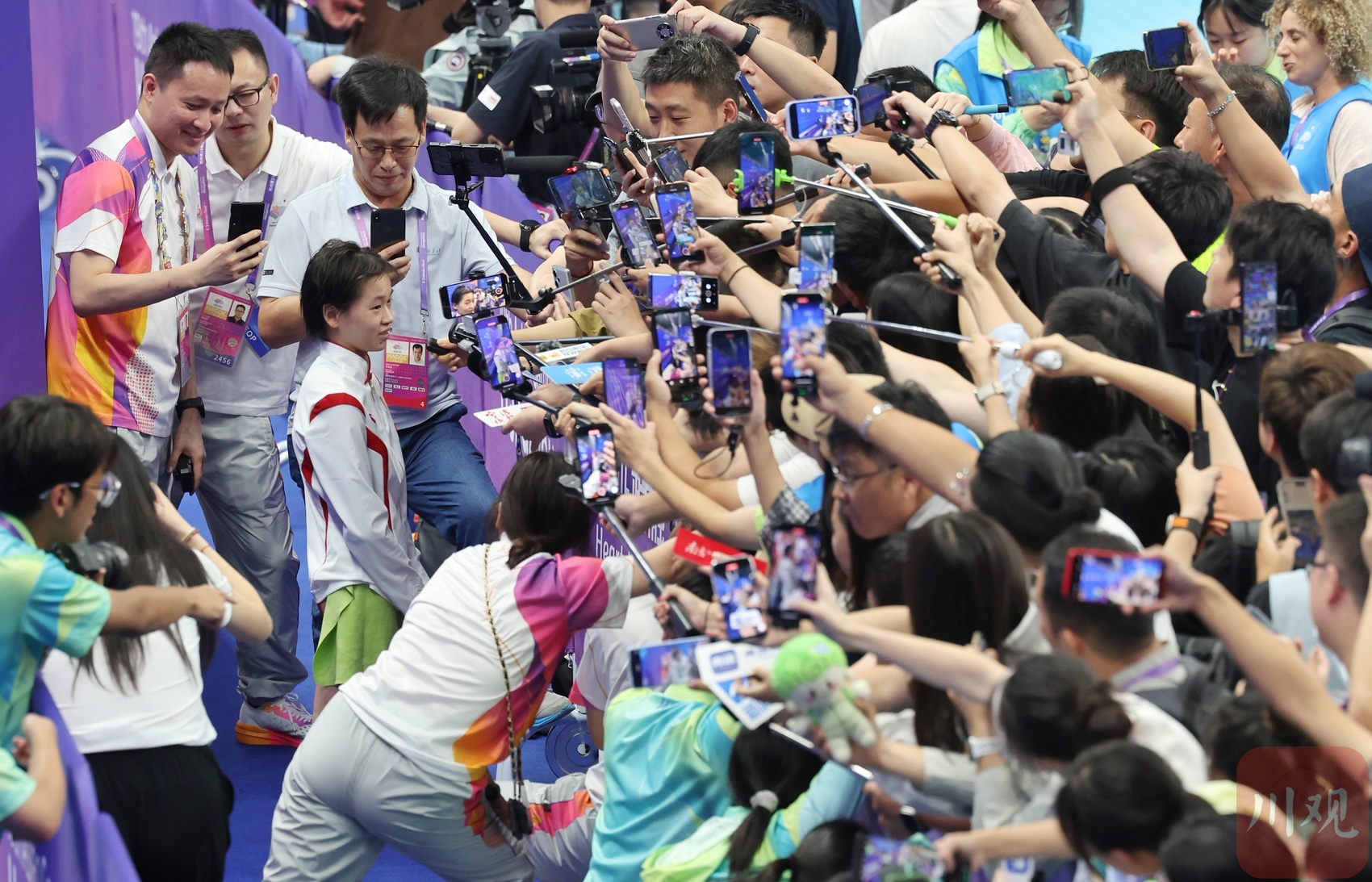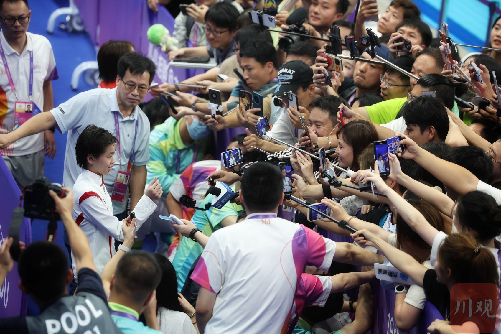 赛后,全红婵在混合采访区接受采访。