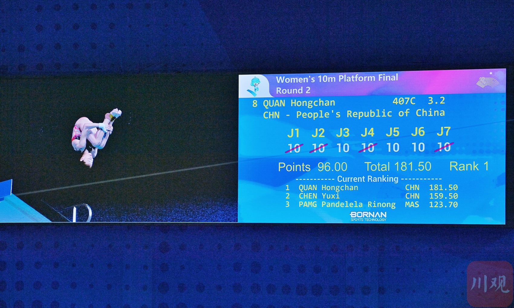 全红婵第二跳,裁判全部给了满分。