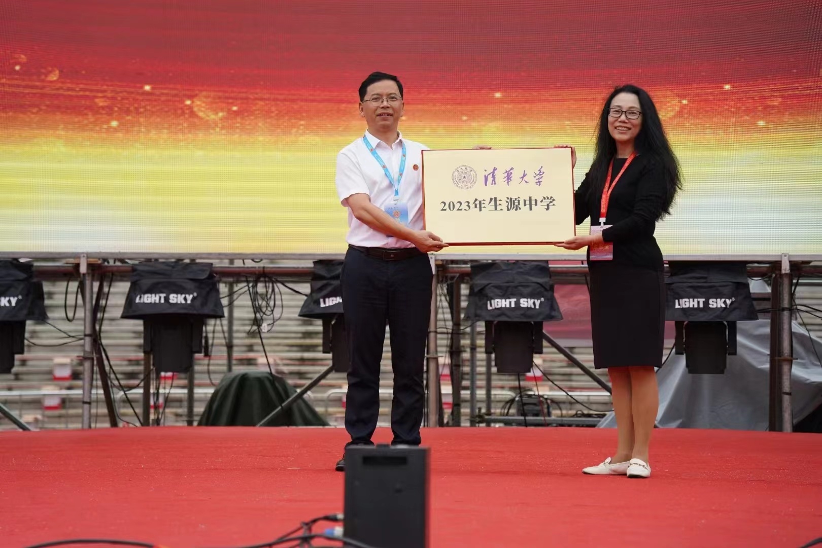 北京天安门国旗班首任班长董立敢向富顺二中授予天安门使用过的国旗。清华大学、中国青少年国防体育发展联盟分别为富顺二中授牌“清华大学生源基地学校”“国防体育进校园试点校”。