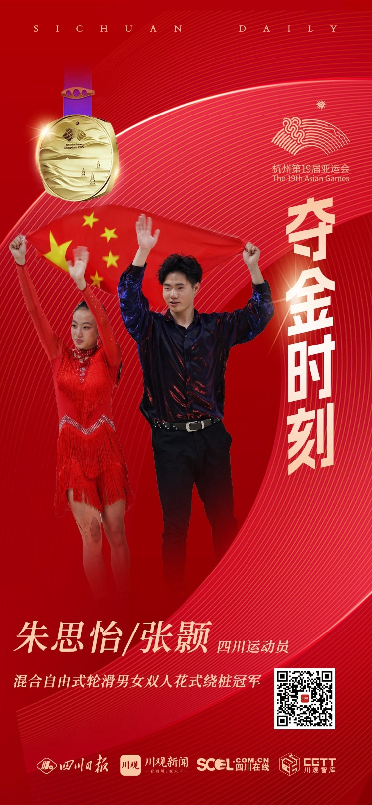 10月4日,杭州亚运会又传喜讯。在杭州亚运会混合自由式轮滑男女双人花式绕桩比赛中,来自四川的中国组合张颢/朱思怡以零罚分的成绩夺得冠军,这是自由式轮滑在亚运会上的首枚金牌,也是四川运动员在杭州亚运会拿到第10枚金牌。