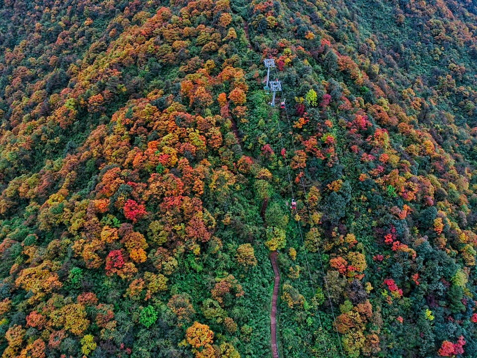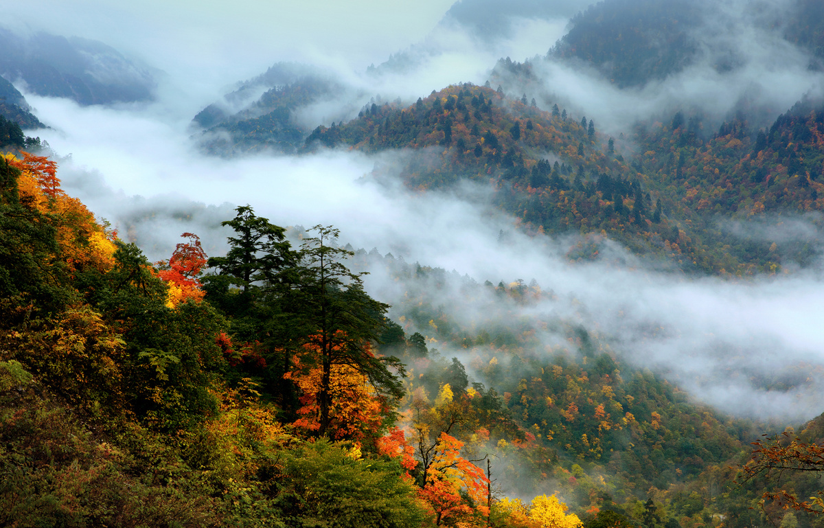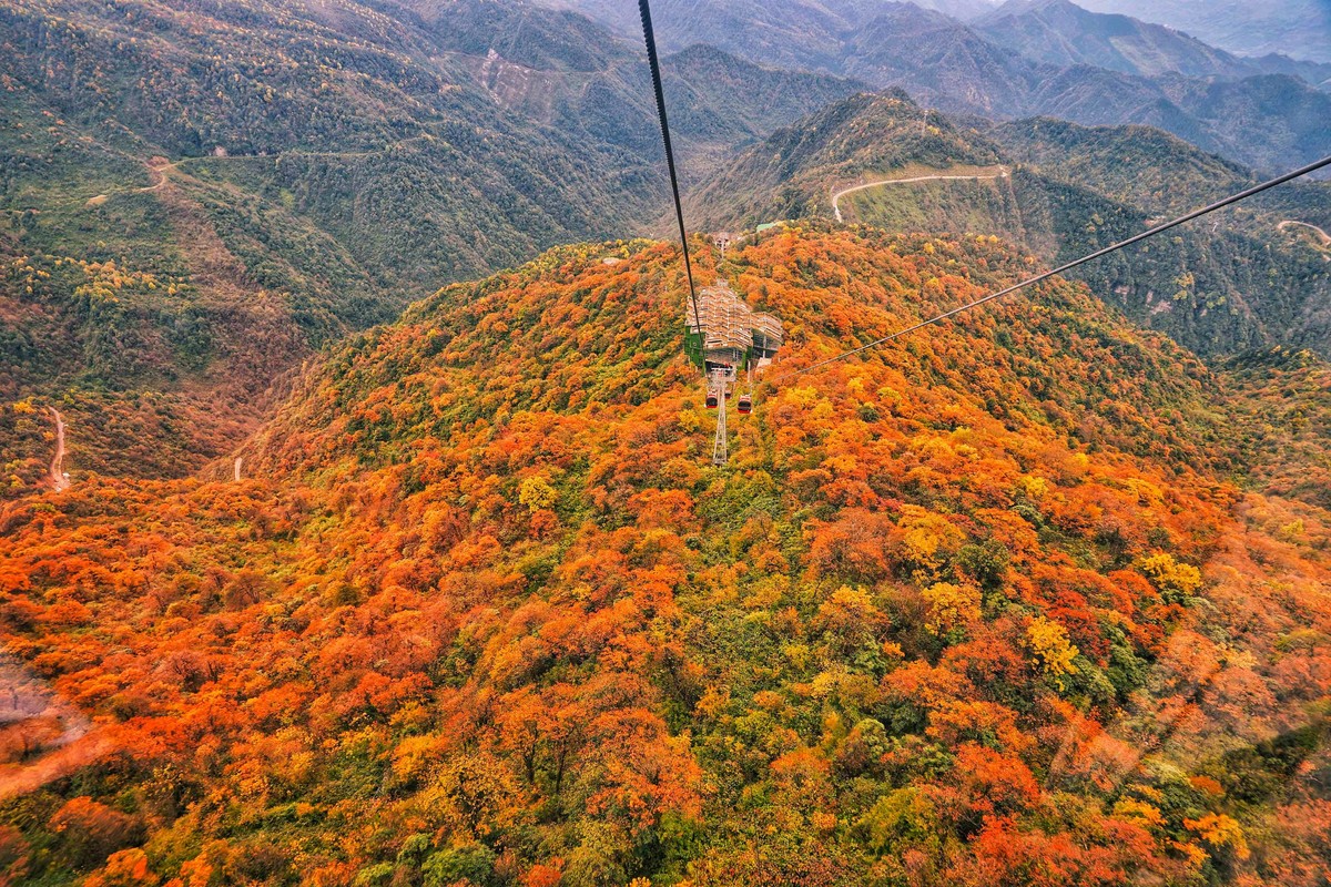 位于眉山市洪雅县的瓦屋山是亚洲最大的桌山,海拔2830米,具有良好的生态环境,是动植物的天堂,拥有各类植被3600余种,每年10月下旬起,漫山遍野树叶通红,映衬着蓝天白云,组成一幅色彩艳丽的金秋图画。如今这里已形成“春看杜鹃 ,夏观飞瀑,秋赏红叶,冬玩雪”的旅游格局。