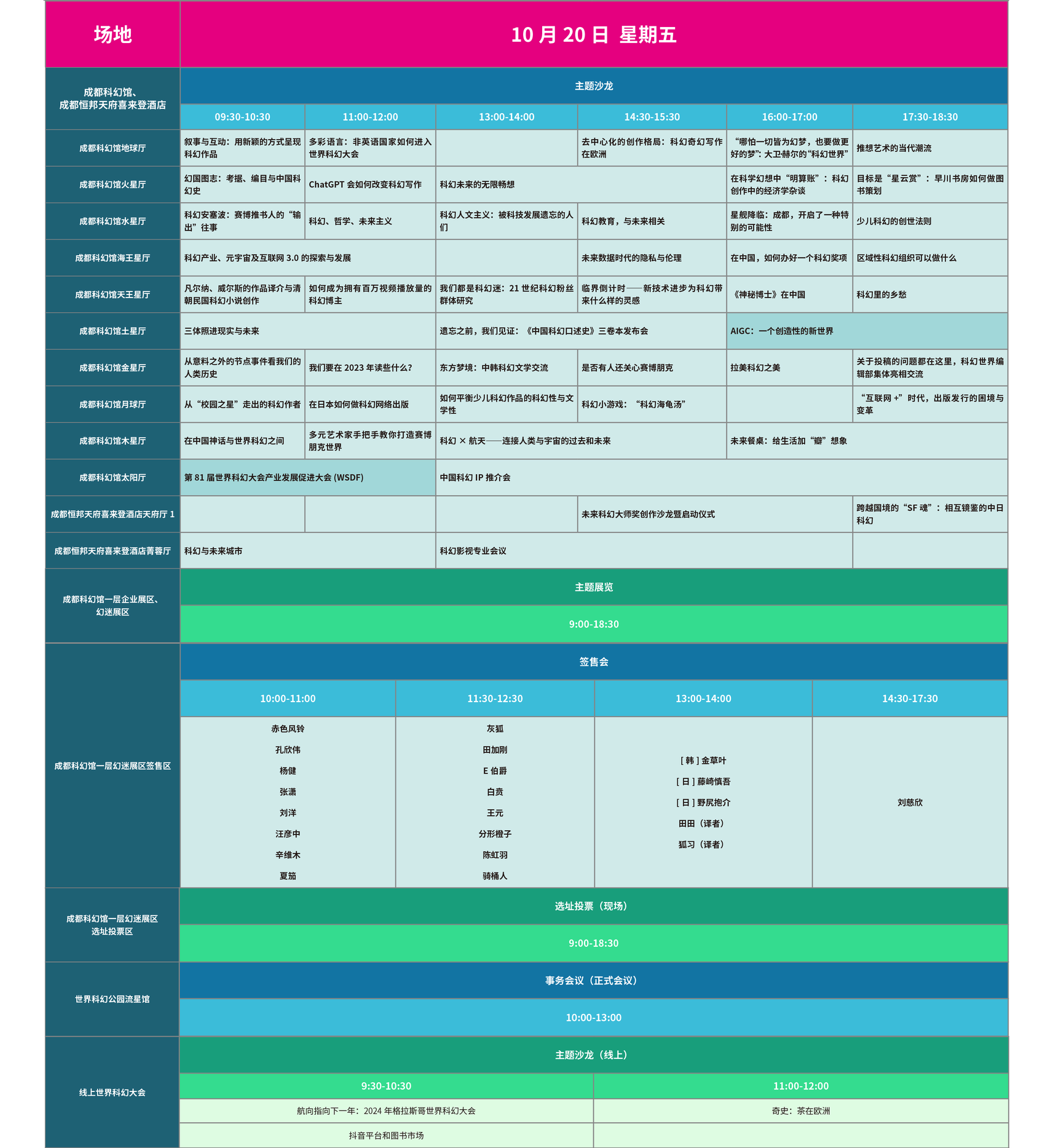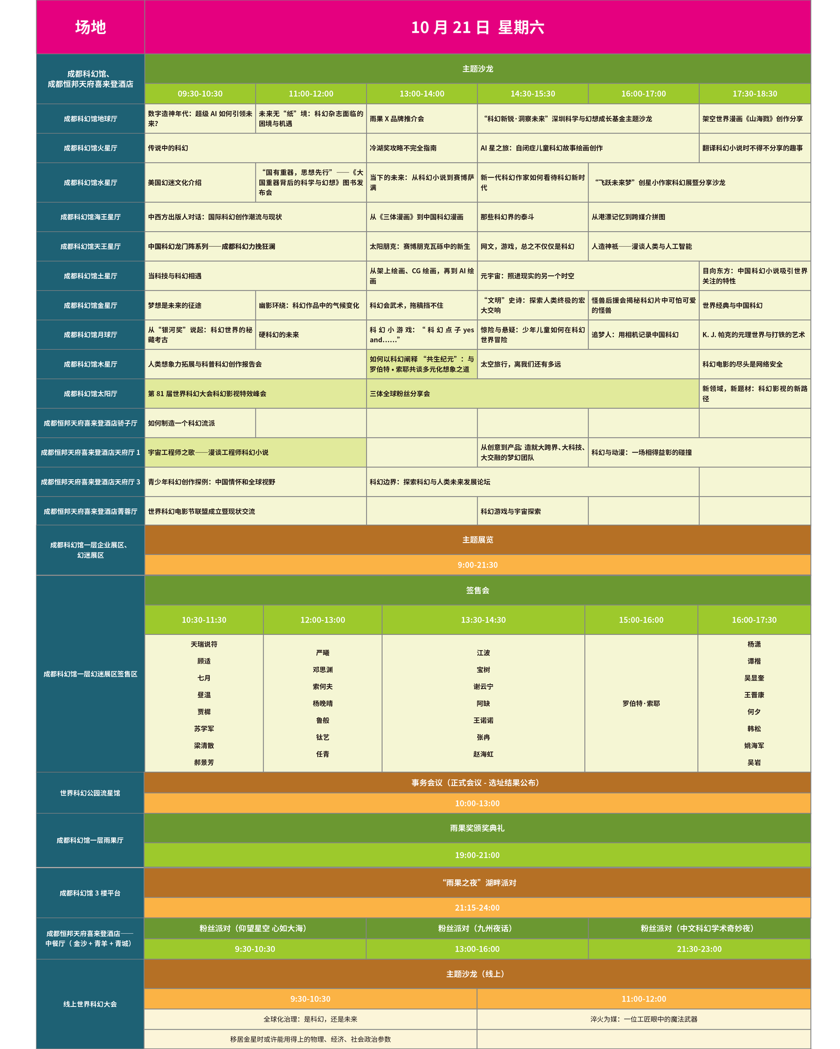 此外,“雨果之夜”湖畔派对将于21日晚9时15分在成都科幻馆3楼平台举行。“与AI(爱)共生”“仰望星空 心如大海”等多场粉丝派对及线上世界科幻大会也期待幻迷们的参与。