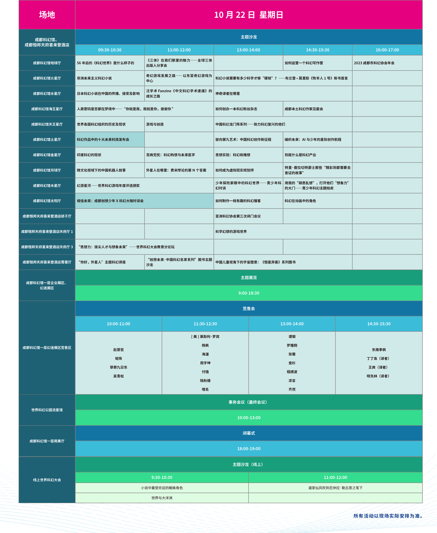 开闭幕式、雨果奖颁奖典礼、主题沙龙、主题展览、选址投票、事务会议、“雨果之夜”湖畔派对、粉丝派对……在10月18日-22日的5天会期中,精彩纷呈的各类活动将轮番上演,从不同形式、不同视角,带给幻迷们不同的惊喜和体验。