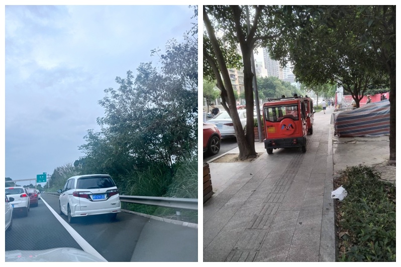川观用户“沫沫”说:马路边上轿车占道,人行道上三轮车占据大半的位置,还把盲道给占了,草丛里的白色垃圾……在这个小小的地方,太多的不文明。