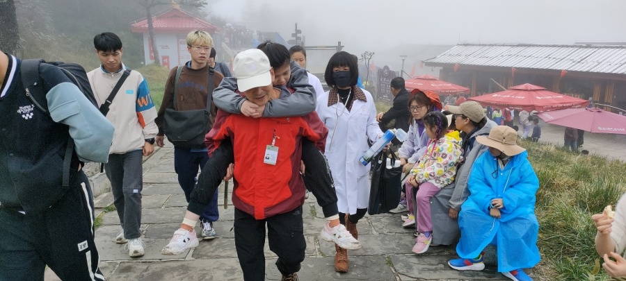峨眉山“心连心旅游服务岗”工作人员为高反游客提供帮助。