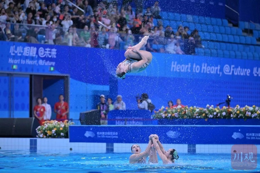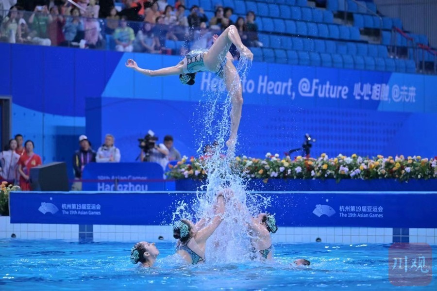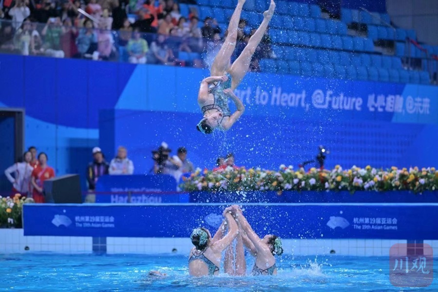 杭州亚运会花样游泳项目在杭州奥体中心游泳馆收官,拥有四川两朵金花肖雁宁、向玢璇的中国花样游泳队,在最后一个集体自由自选的项目中,拿到341.4875分,最终以总成绩868.9676分的成绩夺得本届杭州亚运会的一枚金牌,这枚金牌不仅是中国体育代表团在本届杭州亚运会上拿到的第201枚金牌,同时也是四川运动员在本届杭州亚运会上拿到第17枚金牌。
