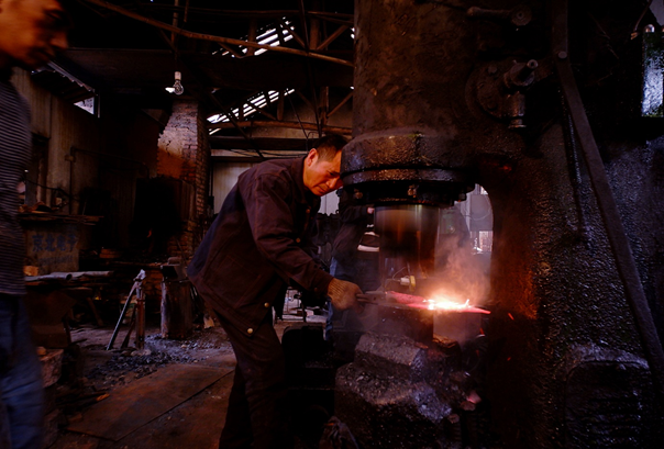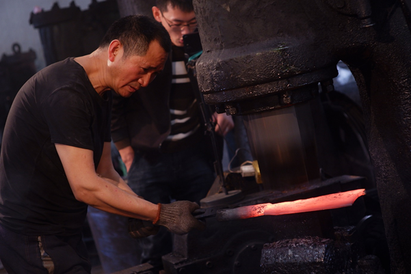 一把好刀,要经过上千次反复捶打。图为周光兴锻打钢材。
