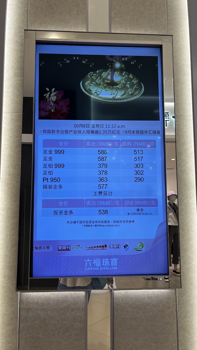 10月8日,成都某商场品牌珠宝商黄金挂牌价。