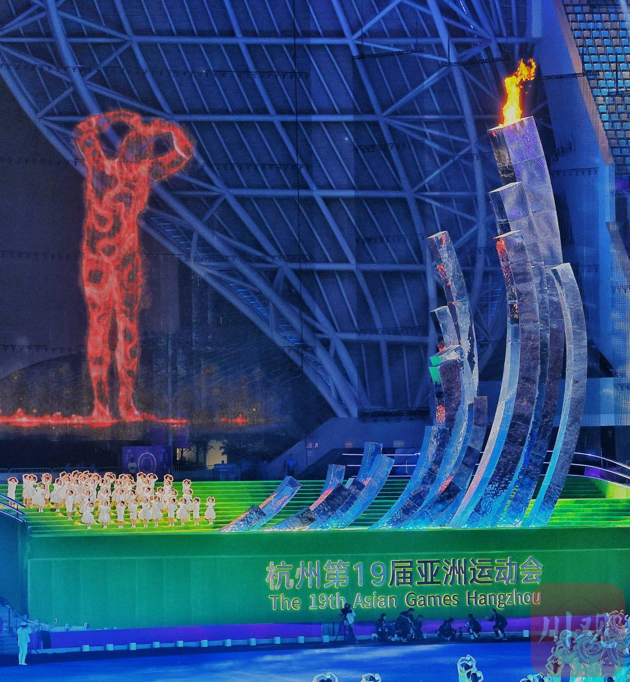 此前,9月23日的杭州亚运会开幕式上,由超过1亿数字火炬手的光点汇聚而成的“数字火炬人”踏浪而来,与现场火炬手携手,将来自良渚古城遗址的圣火共同汇聚到主火炬上。