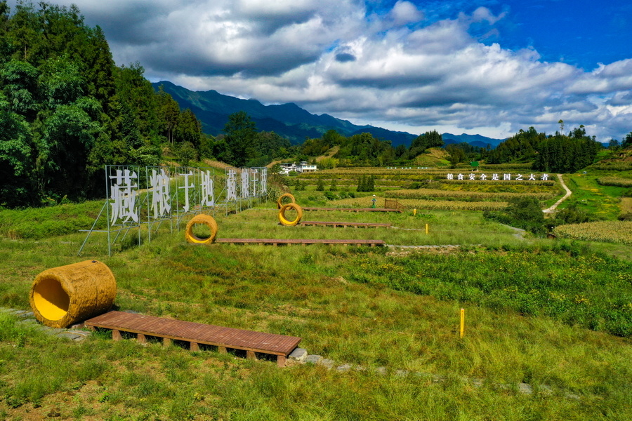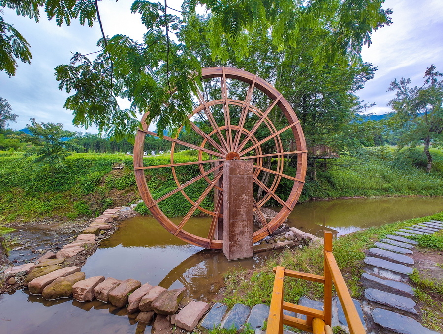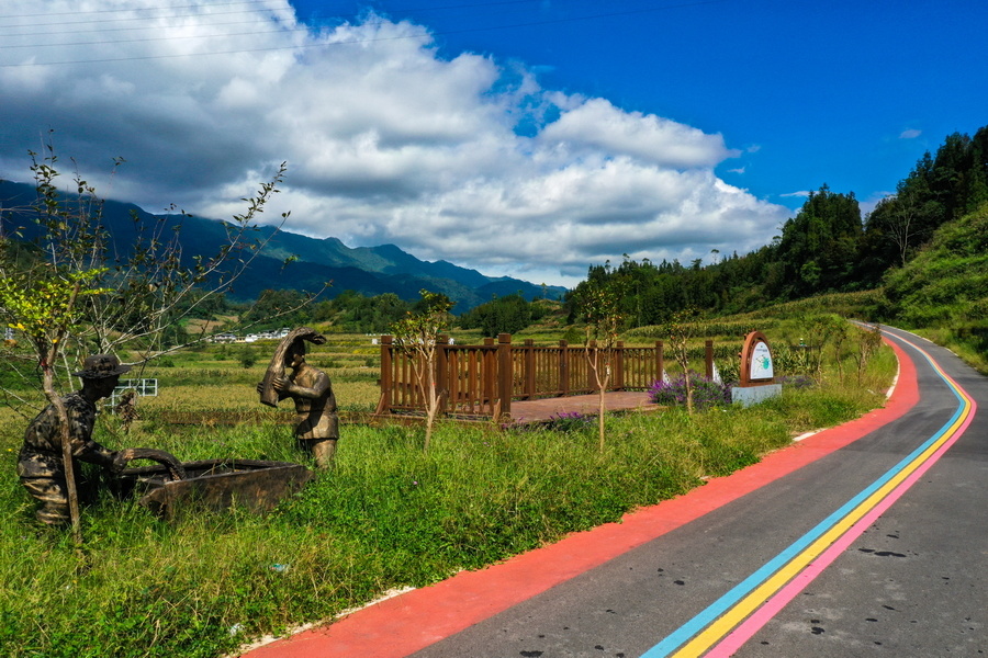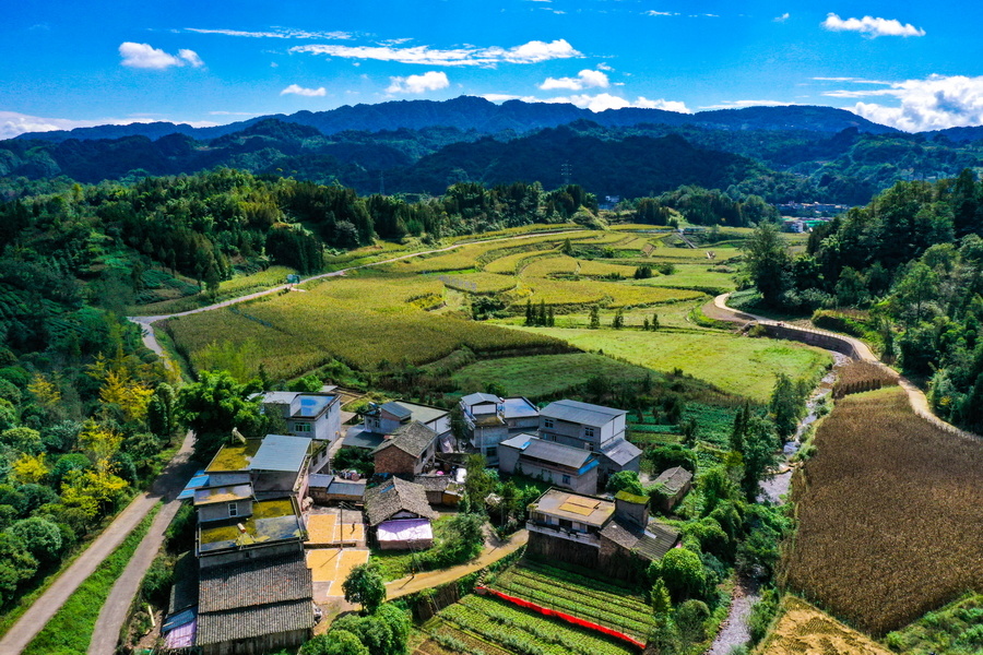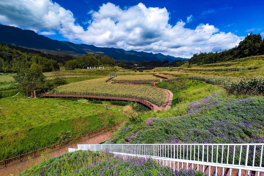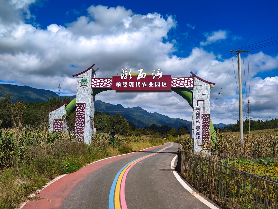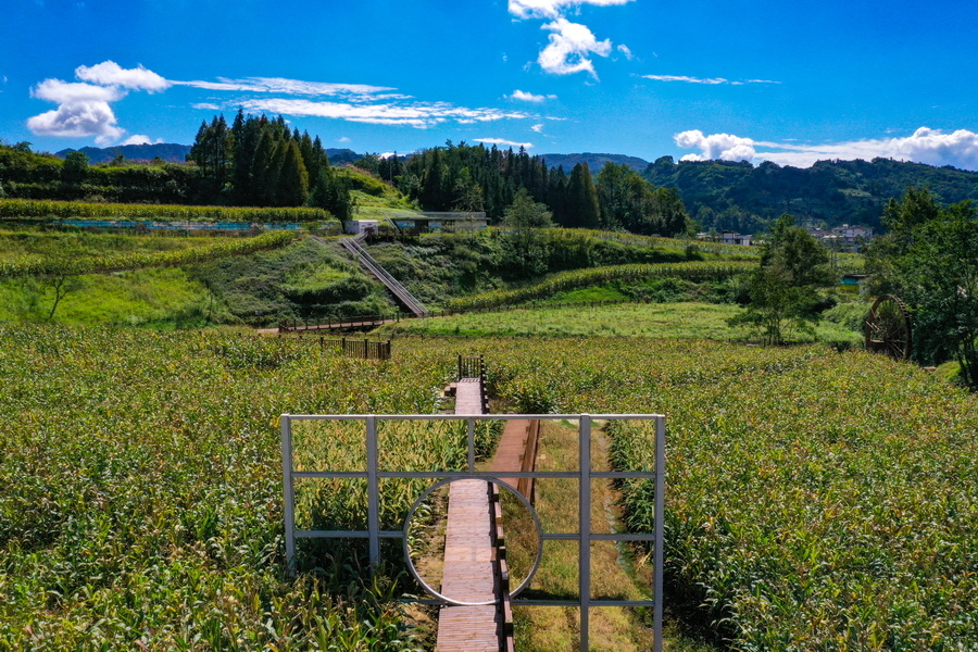 10月7日,走进雅安市雨城区碧峰峡镇三益村粮经现代农业园区(三益村粮蔬研学基地),田间地头的水稻和玉米泛出秋日丰收季的金黄,起伏连绵的农田、色彩明艳的步游道、隐匿林间的木质水车……一处处别致的田园小景勾勒出一幅美丽的乡村画卷。