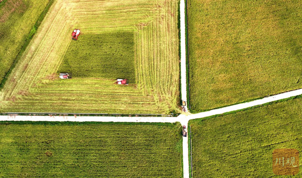 在眉山市仁寿县珠嘉镇花园社区,越友种植专业合作社的几台收割机正在收获托管的水稻。潘建勇 摄