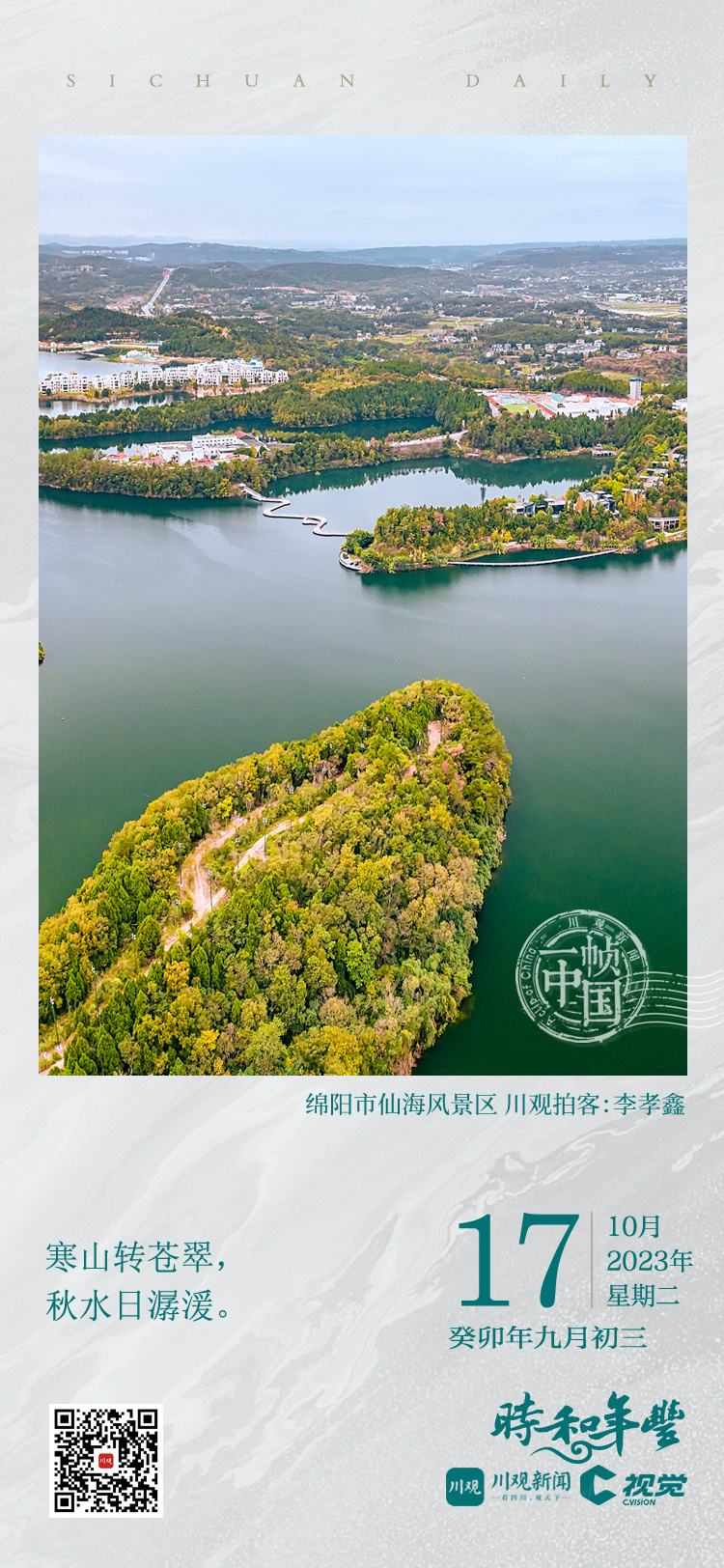 秋风萧瑟,碧波不惊,凡岛皆金黄,白楼轻烟起,秋色诗意浓,欢呼丰收喜。好一派川蜀秋天的景色。