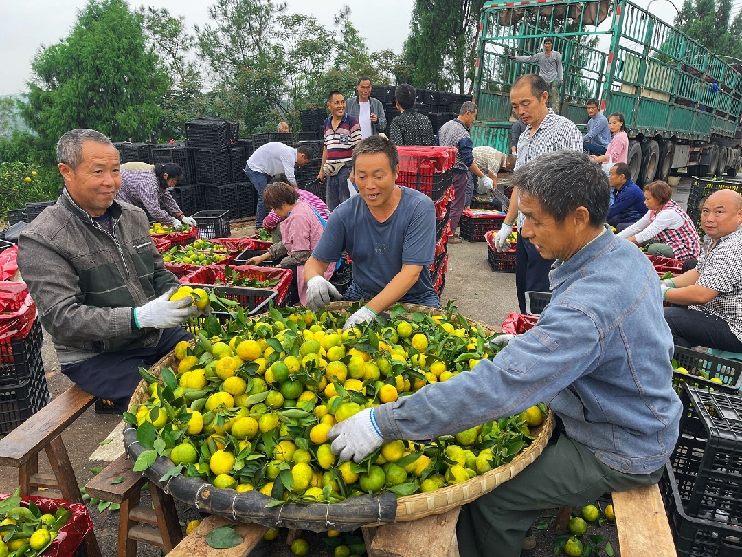 “龚祥龙大哥,这边有26箱包装好的蜜橘,你找两个兄弟伙一起装上车。”“杨二哥,这边又来了3辆摩托车和两挑蜜橘,共有13筐,快来一起帮忙抬。”10月8日,在自贡荣县河口镇河坝湾村8组收购新津蜜橘点位,村民们正忙着抬箩筐、分拣果子、称重、上车……